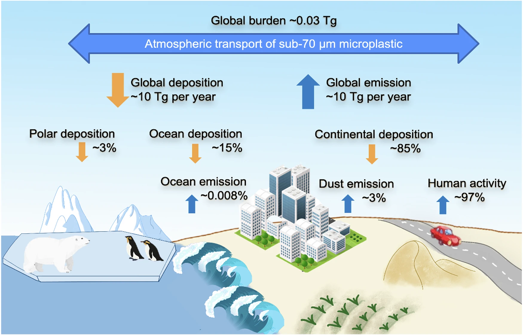 How tiny plastic particles enter the atmosphere is an important question, as airborne microplastics are a potential health threat. Using a global chemical transport model, researchers have provided evidence that, contrary to previous claims, the ocean is not a major source of microplastics to the atmosphere, but a significant sink.