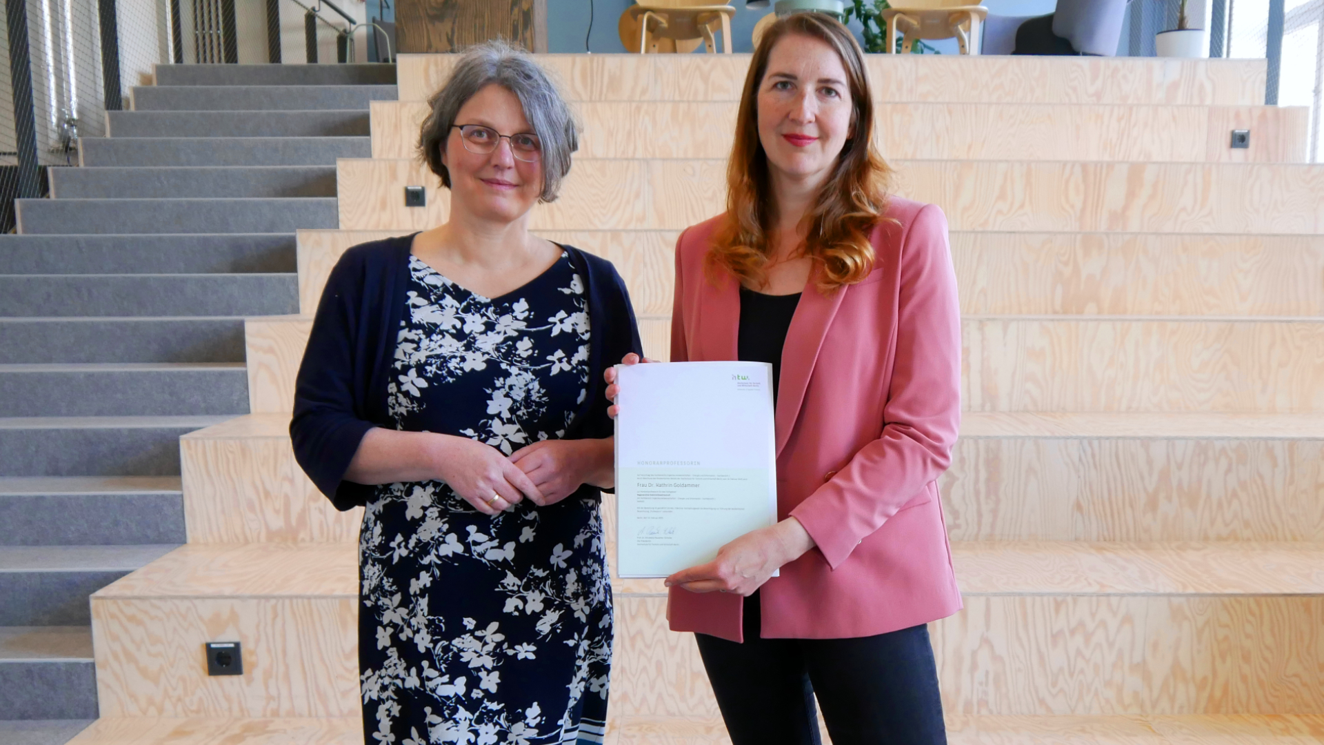 Bildunterschrift: (v.l.n.r) Prof.Dr. Annabella Rauscher-Scheibe, Präsidentin der HTW Berlin ernennt Dr. Kathrin Goldammer zur Honorarprofessorin an der HTW Berlin.
