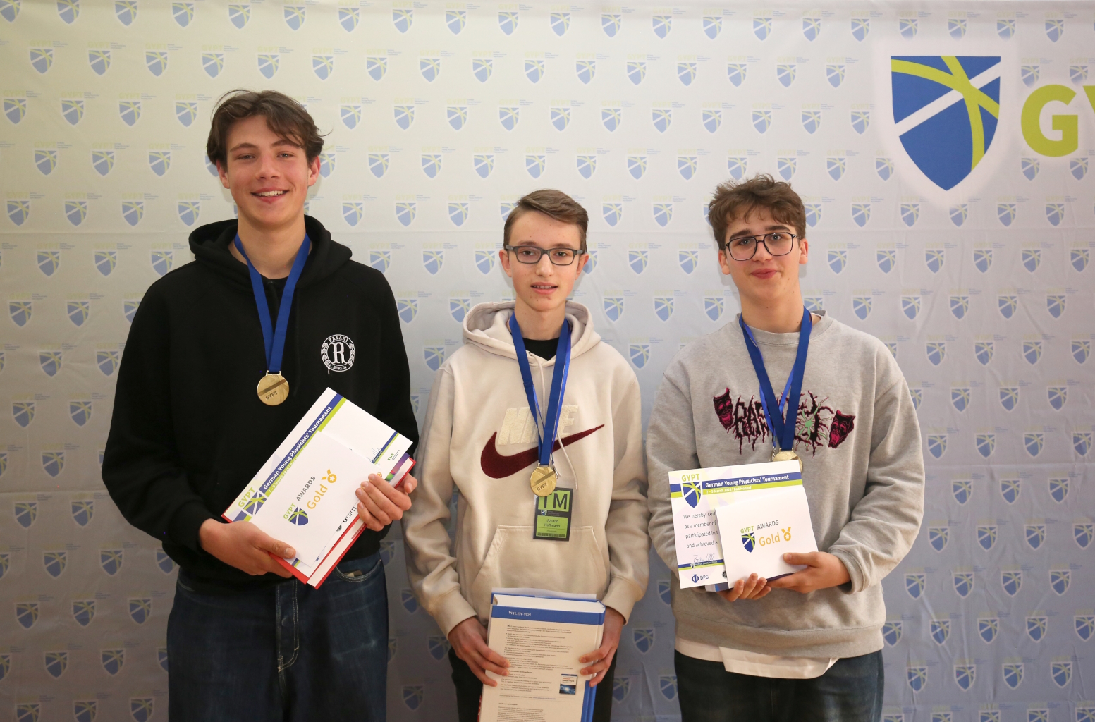 Bad Honnef, 10. März 2025 – Deutsche Physikmeister:innen 2025 dürfen sich ab sofort Benedikt Baum (17), Johann Hoffmann (15) und Maxim Rasch (17) vom Hans-Thoma-Gymnasium in Lörrach nennen. Sie haben dieses Wochenende das 12. GYPT – die deutsche Physikmeisterschaft – für sich entschieden: Mit ihrem Team „impærium“ überzeugten sie die Jury und holten Gold – auf wissenschaftlichen Niveau und Englisch! Das zweitplatzierte Team „Kurtis Knappen“ kommt aus Berlin und besteht aus Simon Hermes (17) und Kurt Stiller (16), beide vom Herder-Gymnasium, und Rusheel Sai Nuthalapati (16) von der Berlin International School. Ebenfalls mit einer Silbermedaille um den Hals beendete das Team „Under Pressure“ mit Benjamin Graf (16) vom Hochfranken-Gymnasium in Naila, Elisa Schöps (17) vom Gymnasium Münchberg und Daniil Shulgin (17) vom Graf-Münster-Gymnasium in Bayreuth das Turnier.