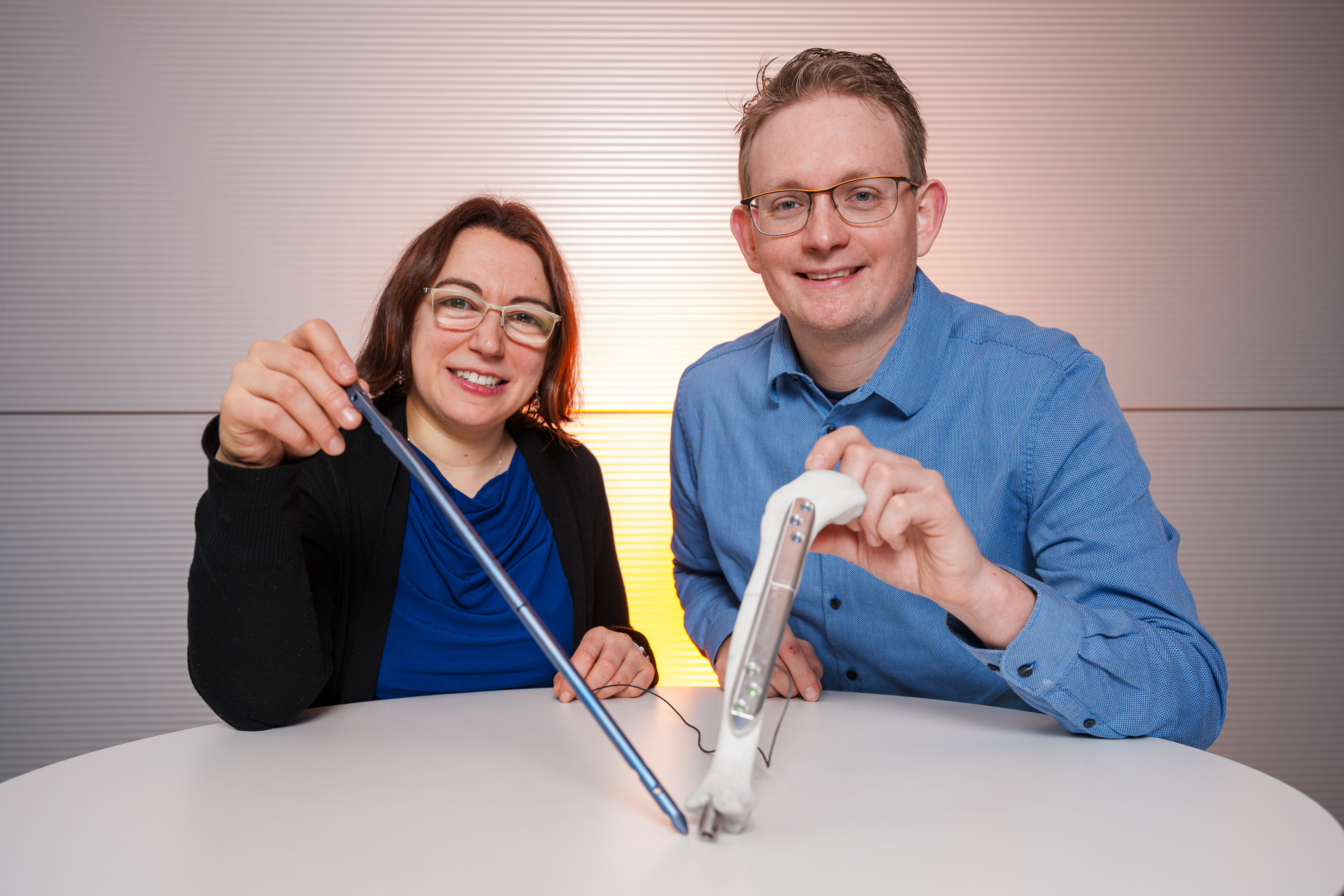 Die Sensortechnik, die nötig ist, um den Stab nach Belieben zu ziehen, liefern die Minimotoren gleich mit. „Der elektrische Widerstand ändert sich, wenn die Drähte sich verformen. Mit Hilfe Künstlicher Intelligenz ordnen wir jeder noch so kleinen Verformung einen präzisen Messwert zu. Wir trainieren mit den Daten neuronale Netze. Auch bei Störeinflüssen rechnet die KI inzwischen effizient und genau“, erklärt Paul Motzki. „Auf diese Weise können wir alle sensorischen Daten ablesen, die nötig sind, um die Drahtbündel anzusteuern“, erläutert Doktorandin Susanne-Marie Kirsch, die an den smarten Implantaten forscht. Und: Dadurch lassen sich zugleich die Heilungsabläufe ablesen: Auch bei der kleinsten Veränderung am Frakturspalt liefern die Drähte andere Messwerte. An ihnen können die Mediziner erkennen, ob neues Knochengewebe wächst.