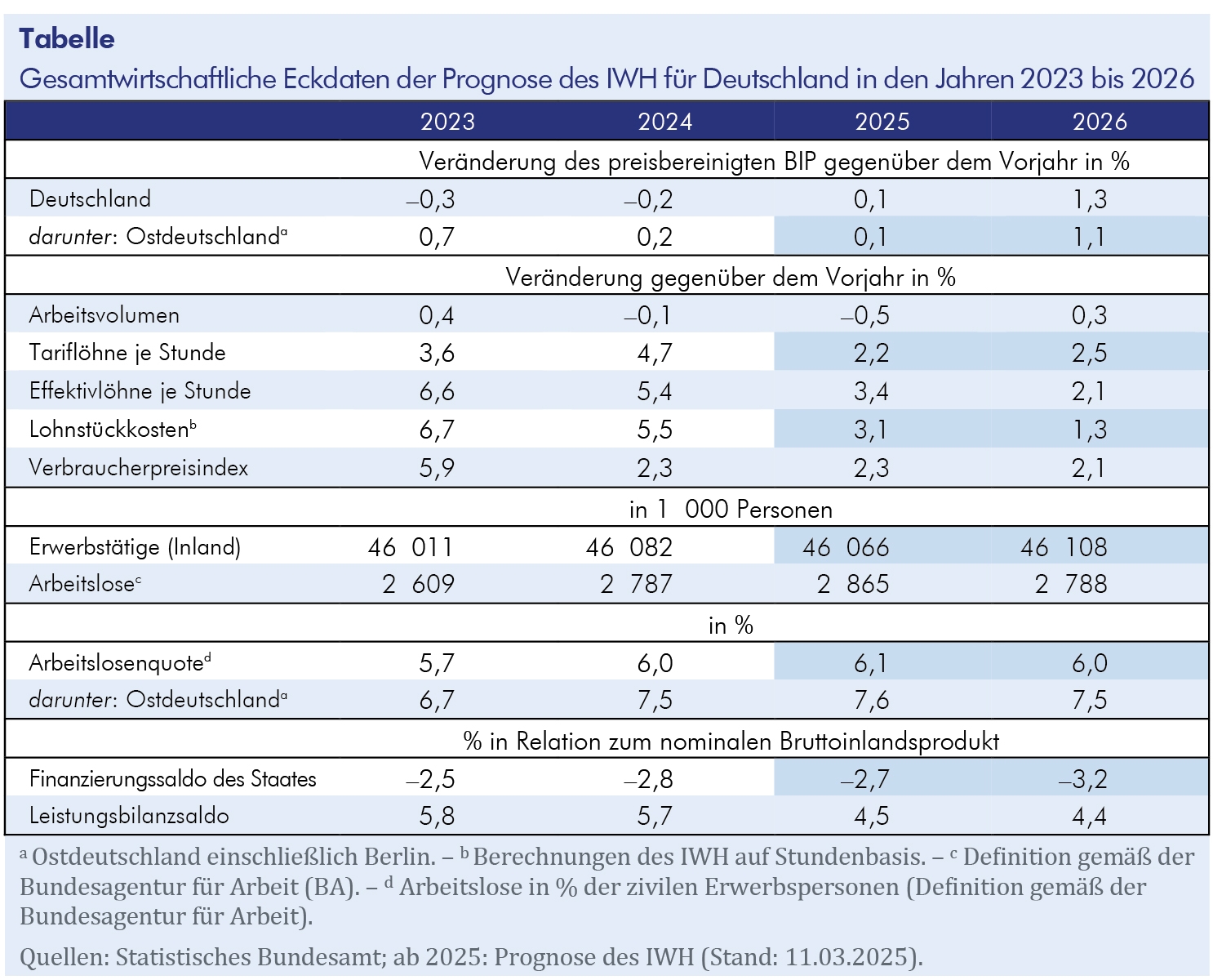 Nach der Frühjahrsprognose des Leibniz-Instituts für Wirtschaftsforschung Halle (IWH) dürfte das Bruttoinlandsprodukt (BIP) im Jahr 2025 etwa so hoch sein wie im Vorjahr und erst im Jahr 2026 nennenswert zulegen, u. a. weil die Unsicherheit über die deutsche Wirtschaftspolitik nach der Regierungsbildung abnehmen dürfte, sodass die Sparquote der privaten Haushalte wieder etwas zurückgehen wird und die schuldenfinanzierten staatlichen Mehrausgaben allmählich nachfragewirksam werden. Die IWH-Konjunkturforscher prognostizieren für 2025 einen BIP-Zuwachs von 0,1%. Im Dezember waren sie noch von einem Zuwachs von 0,4% für 2025 ausgegangen. Ähnlich sind die Aussichten für Ostdeutschland, wo die Produktion allerdings, anders als in Deutschland insgesamt, im Jahr 2024 leicht gestiegen sein dürfte.
