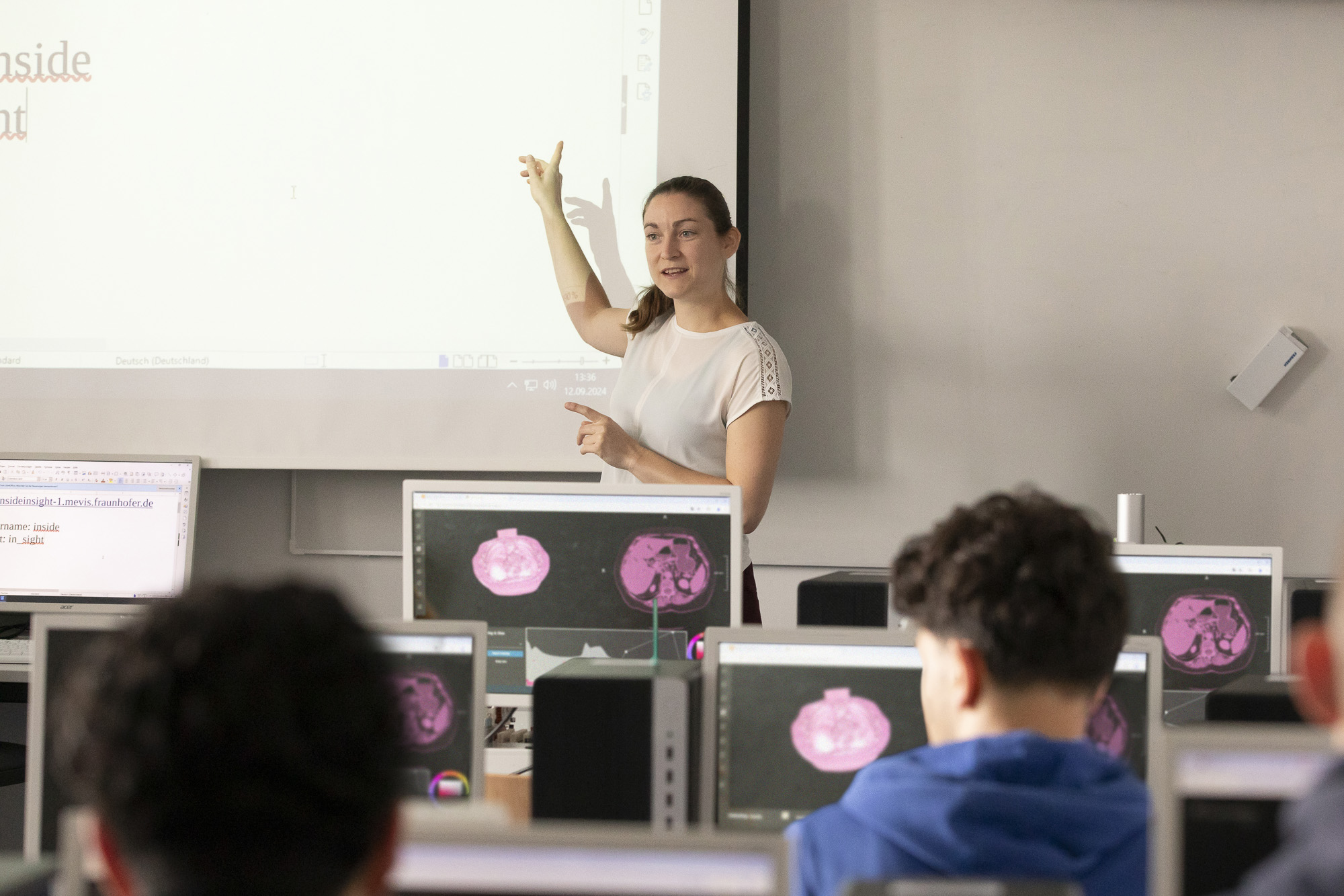 Siebte Schulstunde an der Oberschule am Waller Ring: Es war ein langer Tag, aber von Müdigkeit ist im Computerraum wenig zu spüren. Das Bild, das die Mathematikerin Dr. Anna Rörich per Laptop an die Tafel wirft und das die Schüler:innen zeitgleich vor sich auf ihren Bildschirmen haben, weckt deren Interesse. Zu sehen sind MRT-Aufnahmen eines menschlichen Kopfes. Irgendwo in den Schichtbildern ist ein symbolischer Tumor in der Form eines Herzens versteckt. „Versucht es zu finden und möglichst genau zu vermessen“, fordert die Wissenschaftlerin den Kurs auf.