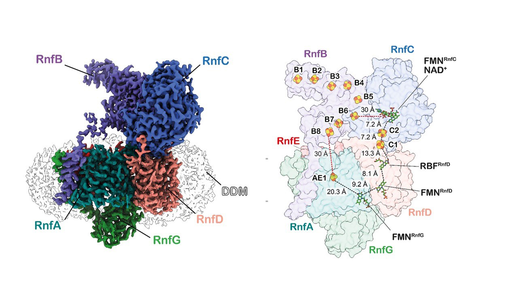 2) Structure and electrical connectivity in the Rnf complex of Acetobacterium woodii. Graphic: Kumar et al., 2025