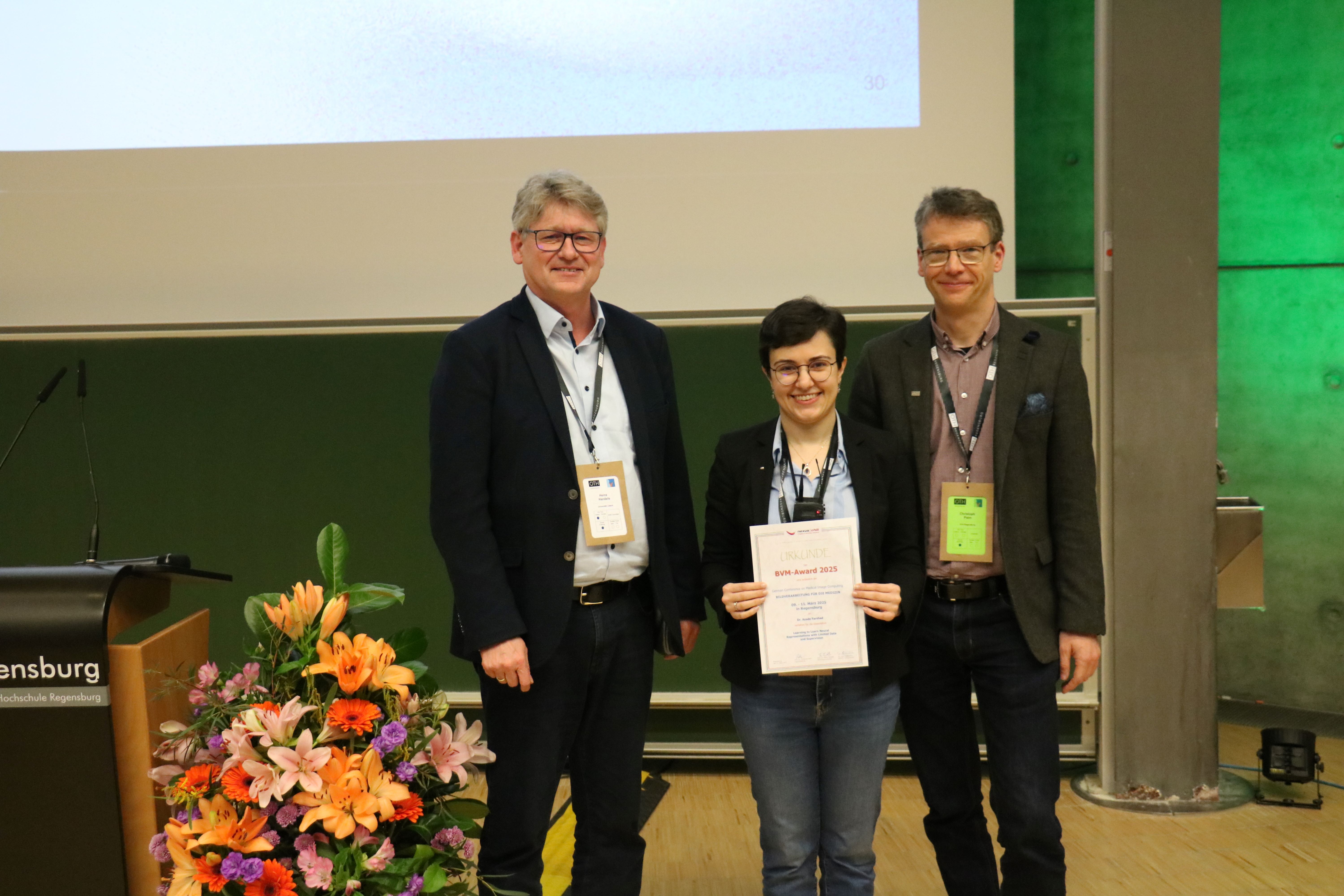 Ein zentrales Anliegen der BVM ist die Förderung des wissenschaftlichen Nachwuchses. Die Konferenz bietet Doktorandinnen und Doktoranden sowie Studierenden eine ideale Plattform, um ihre Forschungsergebnisse zu präsentieren, wertvolles Feedback zu erhalten und sich mit Expertinnen und Experten auszutauschen. Besonders herausragende Arbeiten wurden mit Preisen ausgezeichnet, darunter der BVM-Award für die beste Abschlussarbeit im Bereich der medizinischen Bildverarbeitung. In diesem Jahr ging die Auszeichnung an Dr. Azade Farshad von der TU München für ihre exzellente Dissertation unter der Betreuung von Prof. Dr. Nassir Navab.