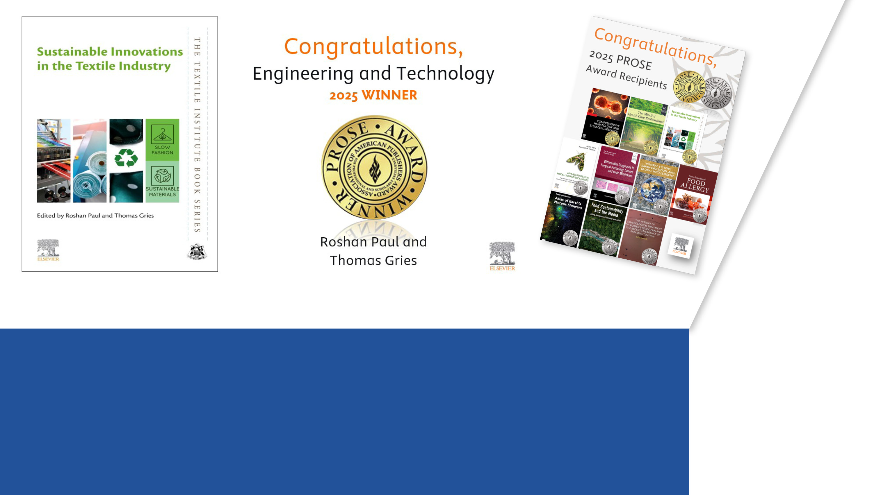 Roshan Paul and Thomas Gries from the Institut für Textiltechnik (ITA) of RWTH Aachen University https://www.ita.rwth-aachen.de/cms/~jezh/ITA/lidx/1/ were honoured as category winners in Engineering and Technology for their book ‘Sustainable Innovations in the Textile Industry’.