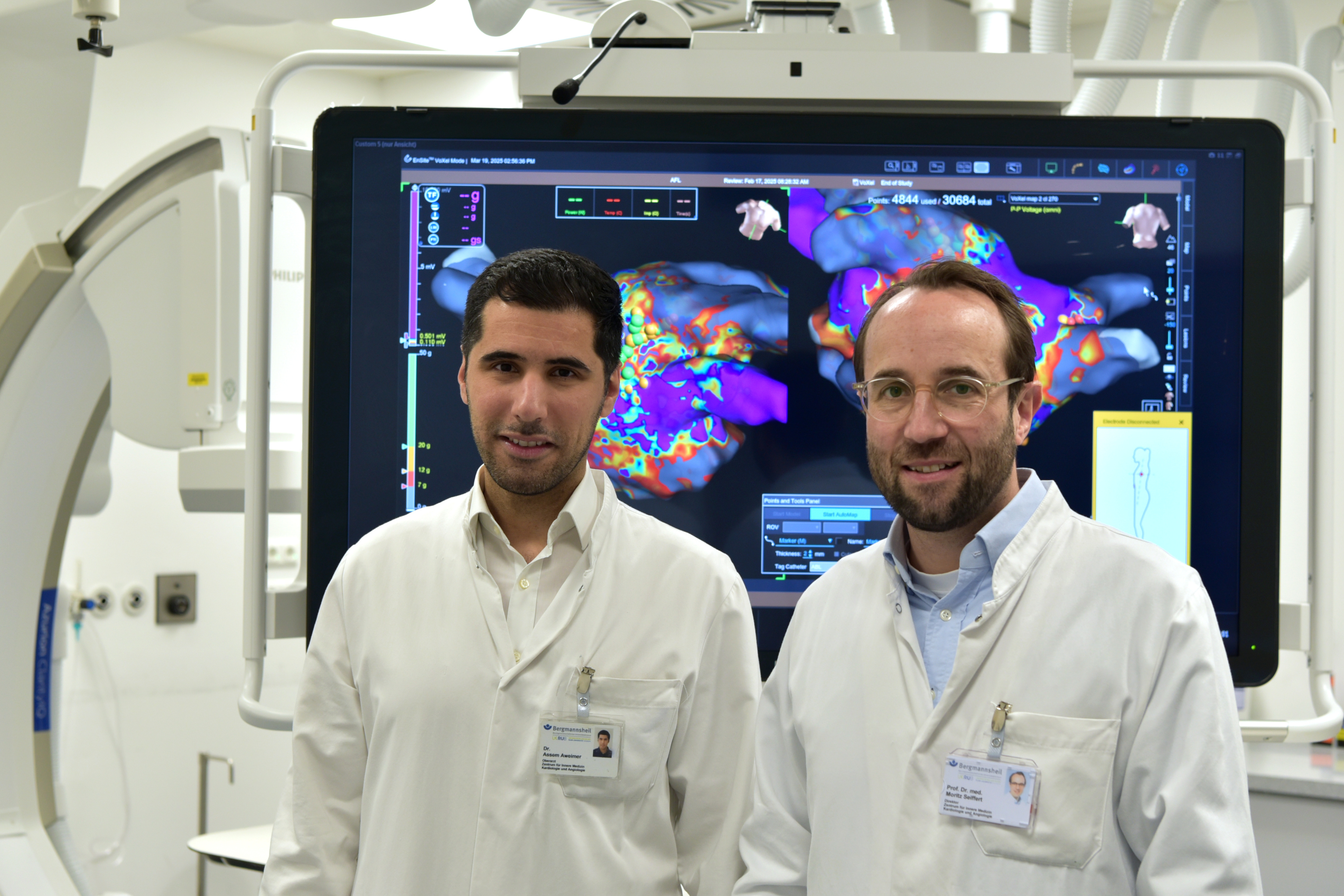 Herzrhythmusstörungen wie das Vorhofflimmern gehören zu den Volkskrankheiten. Sie können sich in Herzrasen und Luftnot äußern oder sogar eine dauerhafte Herzschwäche auslösen – mit erheblichen Folgen für die Lebensperspektiven der Betroffenen. Die Klinik für Kardiologie und Angiologie am BG Universitätsklinikum Bergmannsheil baut ihre Expertise in der Behandlung dieser Erkrankungen weiter aus: Zum 1. März 2025 hat sie einen eigenen Bereich etabliert, in dem die qualifizierte Diagnostik und Therapie von Herzrhythmusstörungen gebündelt ist. Leiter des neuen Bereichs Elektrophysiologie ist Dr. Assem Aweimer, langjähriger Oberarzt der Klinik.