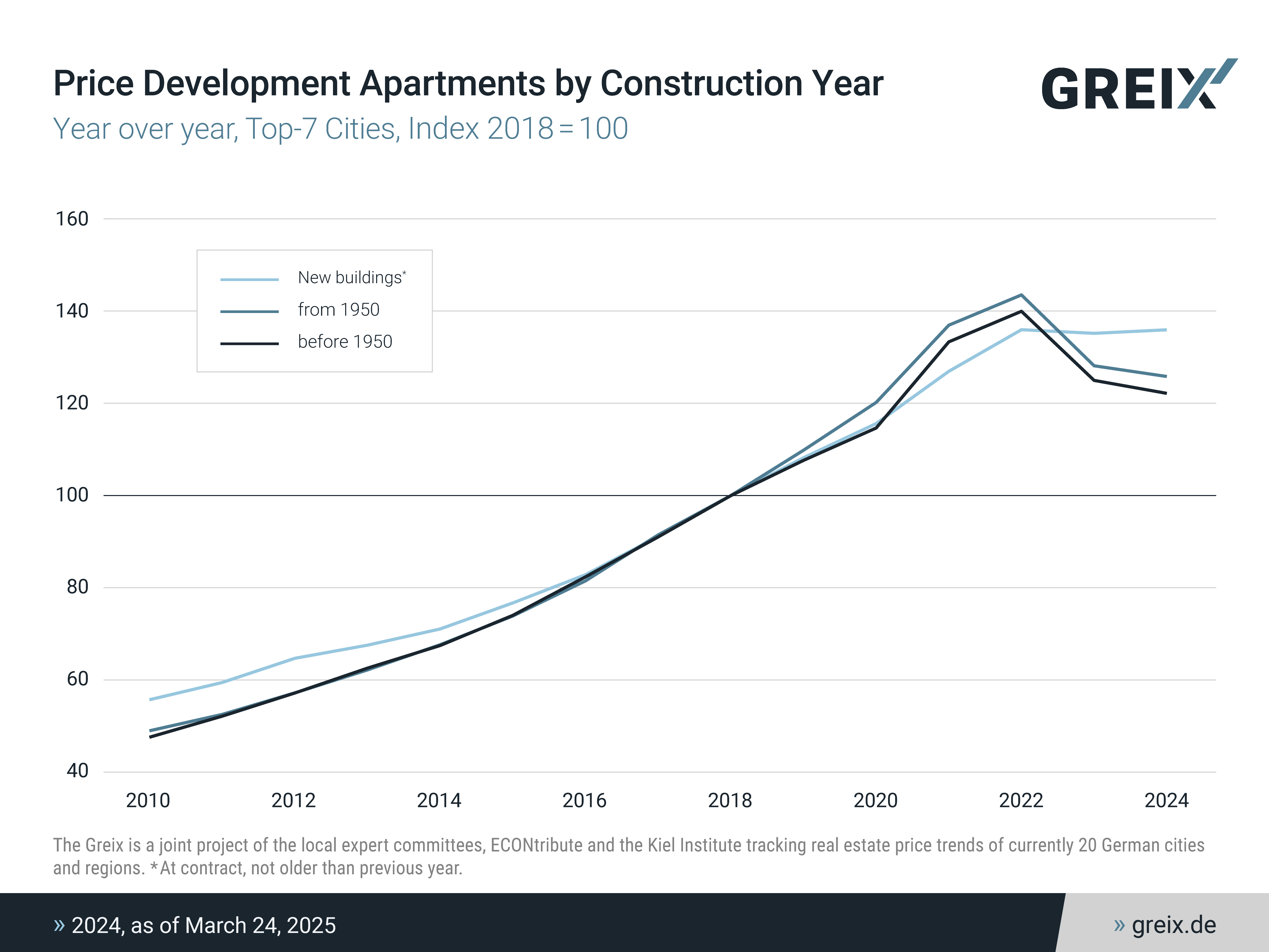 Sales prices for apartments, single- and multi-family homes fell again in 2024 compared to the previous year. This was due to the continued fall in prices in the first quarter. Although a turnaround then set in, it was not strong enough to produce a positive outcome for the year. This is the result of a current evaluation of the German Real Estate Index (GREIX), a joint project of the local expert committees (Gutachterausschüsse), ECONtribute, and the Kiel Institute for the World Economy based on notarized sales prices.
