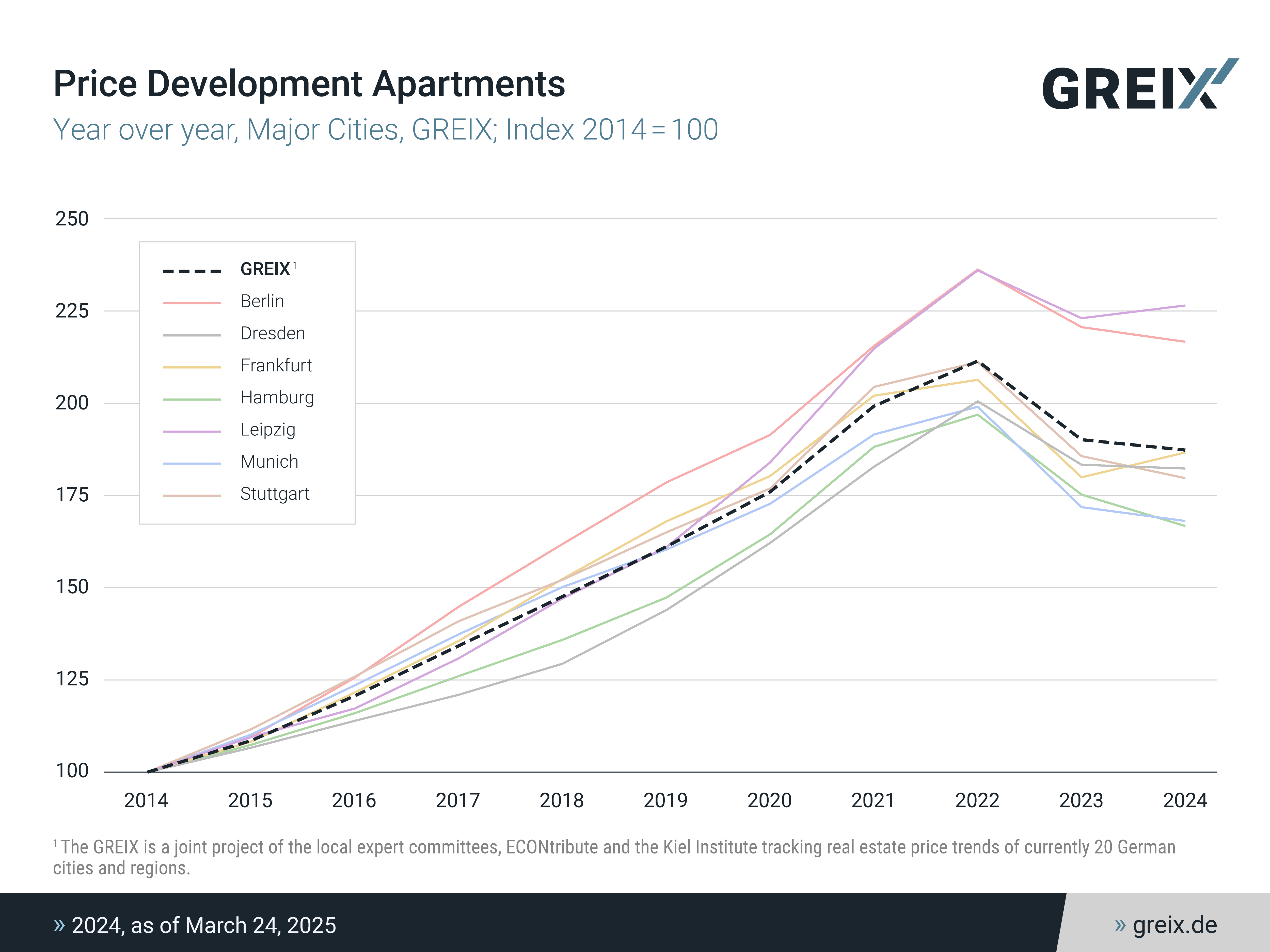 GREIX is financed by public funding and is a project of the Bonn-Cologne Cluster of Excellence ECONtribute, which is funded by the DFG, and the Kiel Institute for the World Economy, in cooperation with the local expert committees. Its aim is to increase price transparency in the real estate market. Different price indices for 20 cities and regions are freely accessible at www.greix.de. Additional cities will gradually be added to the data set.