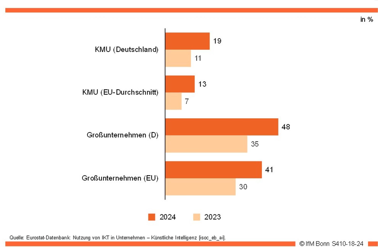 Die Anzahl der kleinen und mittleren Unternehmen (KMU), die Verfahren der Künstlichen Intelligenz (KI) nutzen, ist zwischen 2023 und 2024 um 8 Prozentpunkte auf 19 % gestiegen. Damit liegt der Anteil der KMU in Deutschland mit KI-Nutzung zwar weiterhin über dem EU-Durchschnitt, aber deutlich unter dem Anteil vergleichbarer Unternehmen in Dänemark (26 %), Schweden (24 %) oder Belgien (23 %). Auch öffnet sich in Deutschland weiter die Schere zwischen den KMU und den Großunternehmen: Während in Deutschland nur knapp jedes fünfte KMU Künstliche Intelligenz nutzt, ist es unter den Großunternehmen fast jedes zweite Unternehmen.