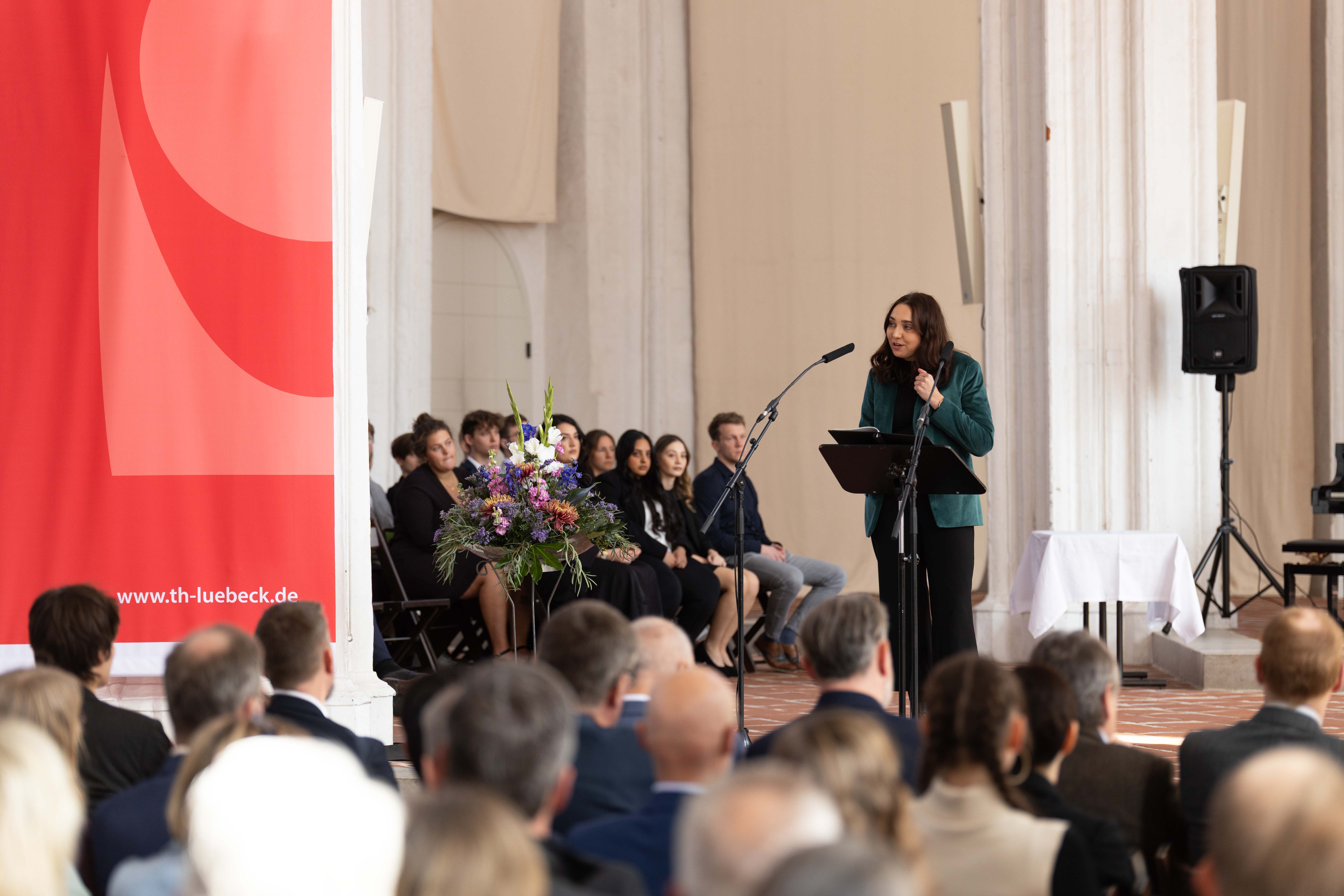 Pastorin Lilly Schaack begrüßte die Absolvent*innen der TH Lübeck und ihre Familien, Freunde und Gäste mit einer freien Nacherzählung der jüdisch-christlichen Schöpfungsgeschichte. „Der Weg vom Chaos zur fertigen Schöpfung. Vielleicht hat es Sie ein wenig an Ihren Weg durch das Studium erinnert. Ob man nun gläubig ist, oder nicht, ob Christ oder Muslima, Hindu oder nicht religiös, es steckt doch Weisheit in diesen alten Geschichten.“