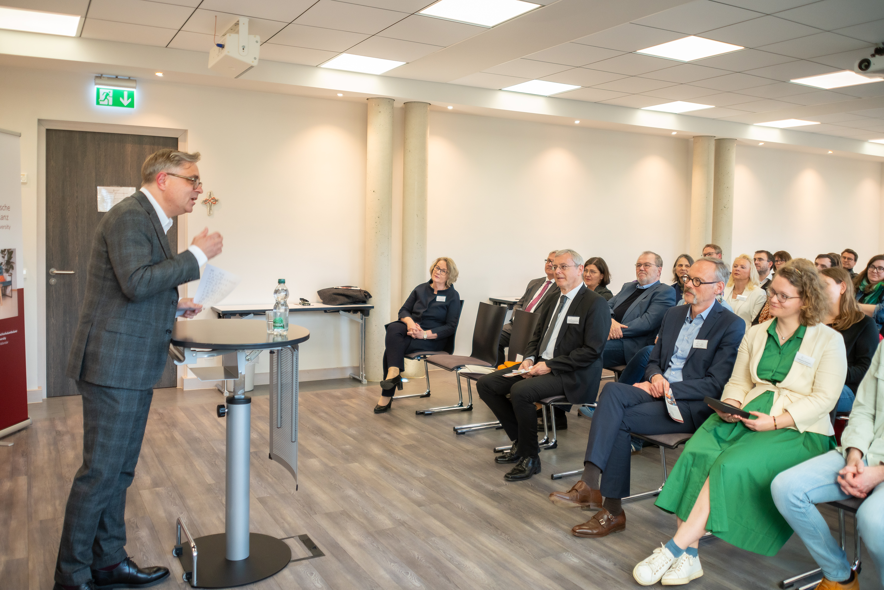 Pater Helmut Scharler SAC, Präsident der Vinzenz Pallotti University, begrüßte die Gäste und verwies auf das Privileg, die therapeutische Arbeit an der Hochschule zu lehren und in der Praxis umzusetzen: „Vinzenz Pallotti wäre stolz, auf diesen Tag zu schauen, kümmerte er sich doch selbst um die Hilfsbedürftigen.“ Nach 80 Jahren Bestehen der Hochschule am Standort Vallendar sei es wunderbar, nun die Eröffnung der Hochschulambulanz zu feiern. Der Provinzial der Pallottiner, P. Markus Hau SAC, hob die Eröffnung als Meilenstein der Entwicklung der Vinzenz Pallotti University hervor, die sich mit der neuen Fakultät grundlegend neu ausgerichtet hat. Die Arbeit der Ambulanz passe sich dabei, auch wenn sie streng wissenschaftlich und nicht theologisch geprägt erfolgt, in das Leitbild der Hochschule ein, denn die Menschen sollen dort „Menschenfreundlichkeit und Güte“ erleben.