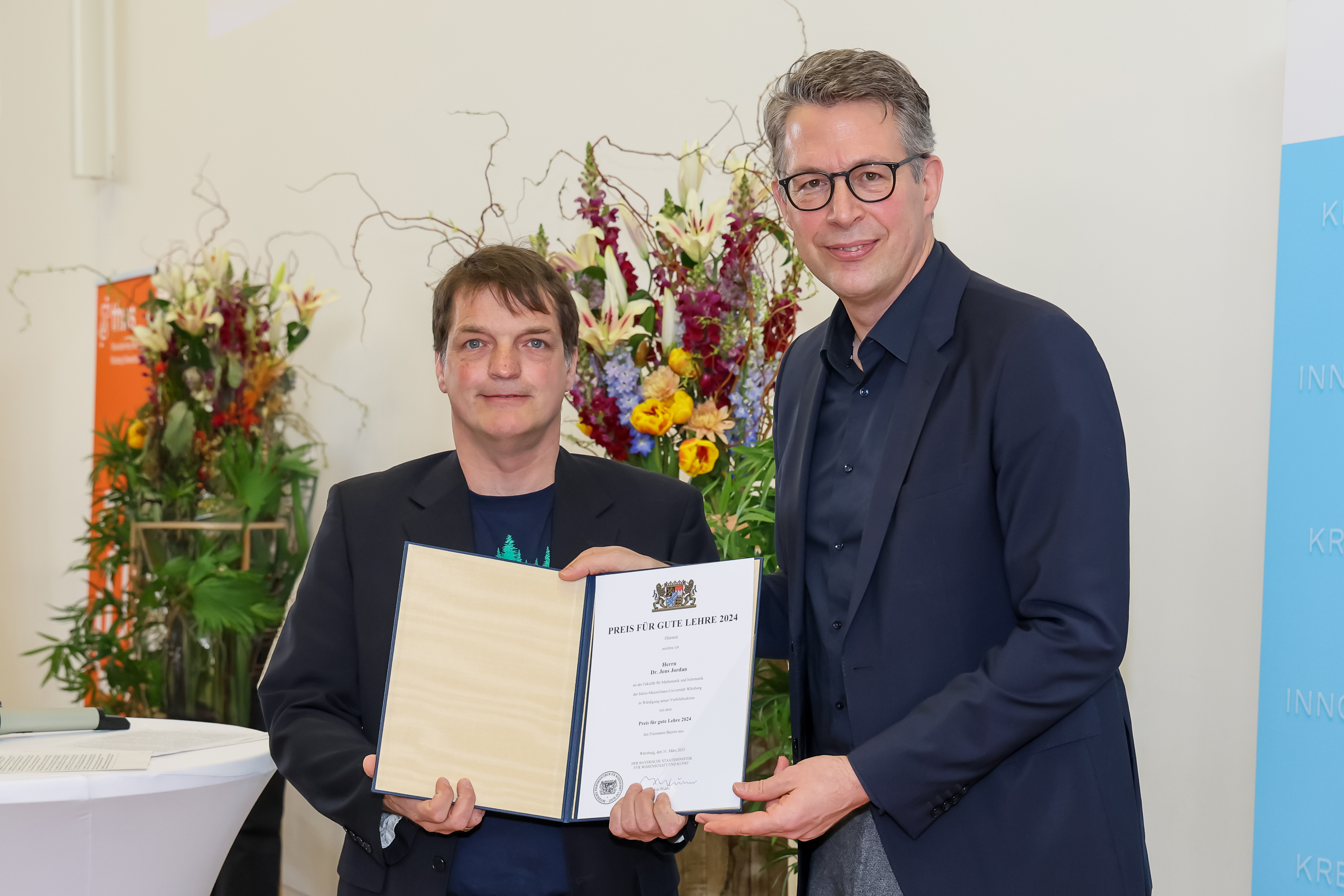 Die JMU hatte also genügend Gründe, den Mathematiker für den Preis für gute Lehre vorzuschlagen, den das bayerische Wissenschaftsministerium jedes Jahr vergibt. Minister Markus Blume überreichte Jens Jordan die mit 5.000 Euro dotierte Auszeichnung beim bayerischen „Tag für gute Lehre“ am 31. März 2025 im Hörsaalgebäude Z6 auf dem Würzburger Hubland-Campus. Insgesamt 20 Lehrende von bayerischen Hochschulen wurden dort ausgezeichnet.