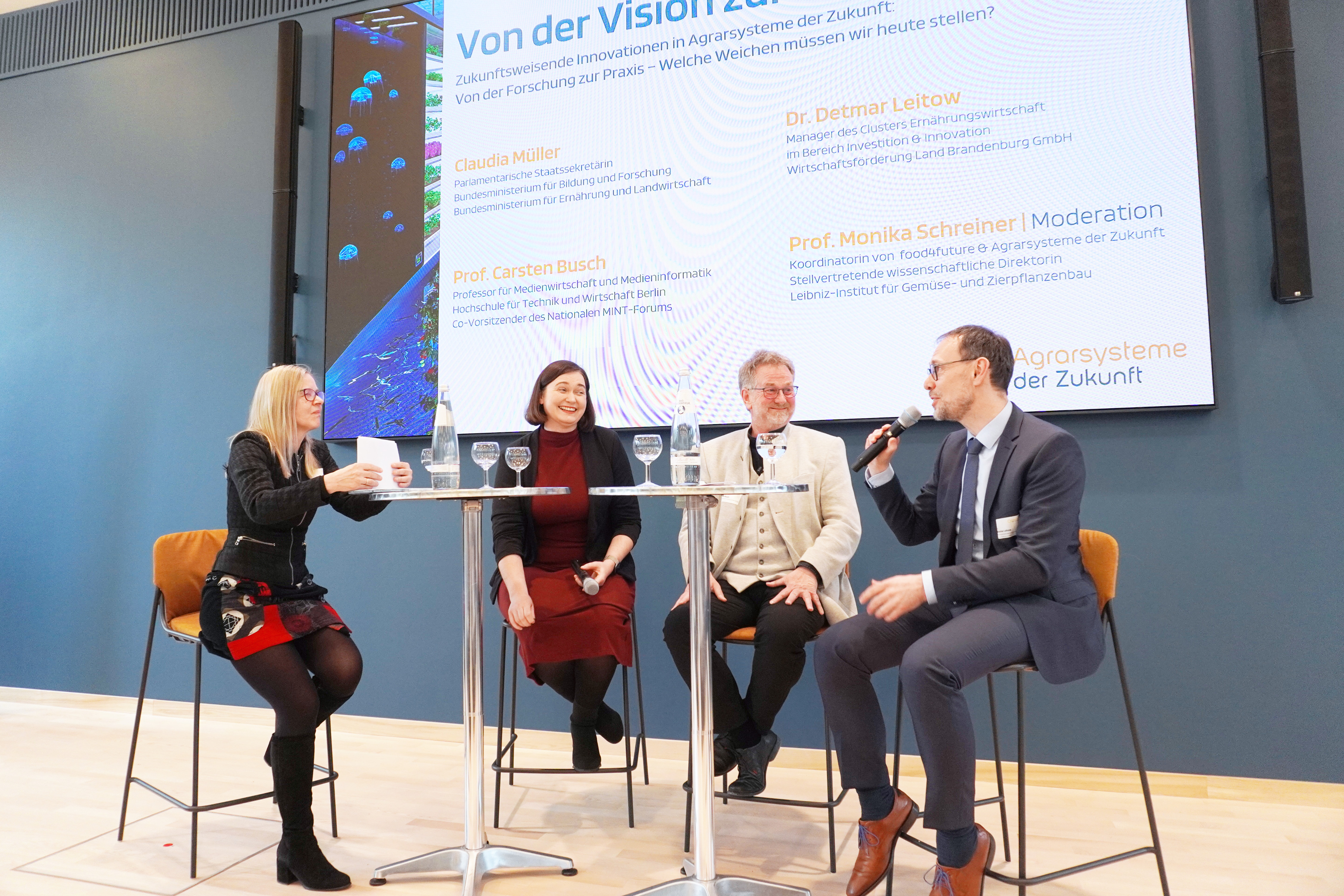 Beim zweitägigen Industrietransfer-Workshop im Potsdamer Leibniz-Institut für Astrophysik Potsdam (AIP) kamen rund 150 Teilnehmende aus Forschung, Industrie, Politik und Zivilgesellschaft zusammen, um die praktische Umsetzung der Forschungsergebnisse und die nächsten Schritte auf dem Weg zu nachhaltigen Agrarsystemen zu diskutierten. Die Parlamentarische Staatssekretärin beim Bundesministerium für Bildung und Forschung, Claudia Müller, betonte bei der Eröffnung die Wichtigkeit umfassender trans- und interdisziplinärer Ansätze für eine nachhaltige und gleichzeitig wettbewerbsfähige Landwirtschaft. In Fachdialogen und interaktiven Workshopsessions wurden technologische Entwicklungen, digitale Anwendungen sowie Hürden bei Markteinführung nachhaltiger Agrarlösungen erörtert. Die Ausstellung zeigte die große Bandbreite der Projekt-Innovationen: Vom digitalen Tool zur optimalen Platzierung von Insektenwällen für den Erosions- und Diversitätsschutz (DAKIS) über ein Reaktionshalsband für Weidetiere (GreenGrass) und modularen Leichtbau-Kompartimenten zur Indoor-Kultivierung (food4future) bis hin zu mit Spezialsensorik ausgestatteten Drohnen für die KI-gestützte Pflanzenbestandsanalyse (NOcsPS). Ein Food-Tasting bot Kostproben neuer Lebensmittel wie Algen-Eis, Quallensalat und nachhaltig produzierten Räucherfisch.