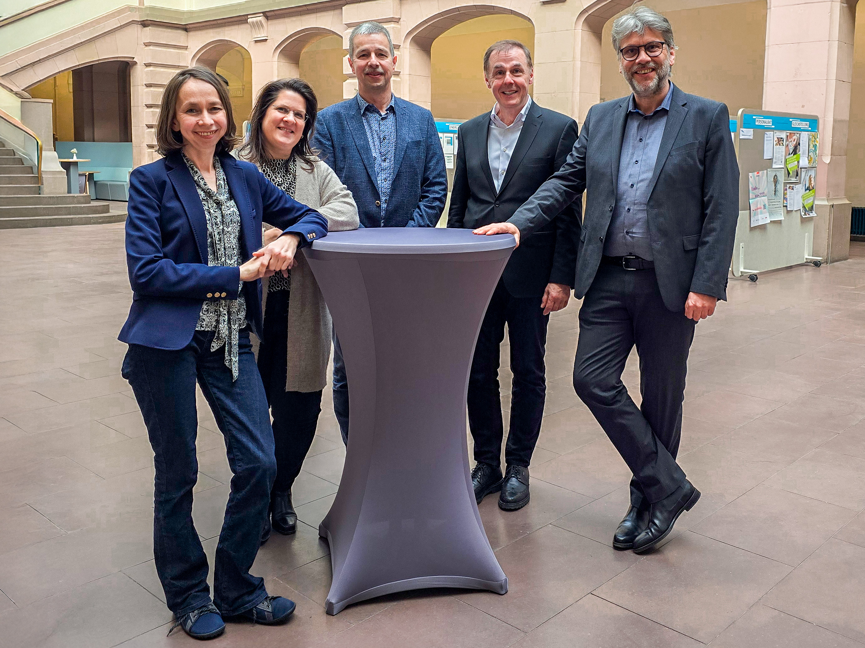 *2 v. l.: Prof. Dr. Zulia Gubaydullina, Studiendekanin Management, Dr. Mareen Benning-Linnert, Studiendekanin Immobilienwirtschaft, Prof. Dr. Andree Rebmann, Studiendekan Bauen, Prof. Dr. Matthias Weppler, Dekan der Fakultät Management, Bauen, Immobilien, Dr. Marc Hudy, Präsident