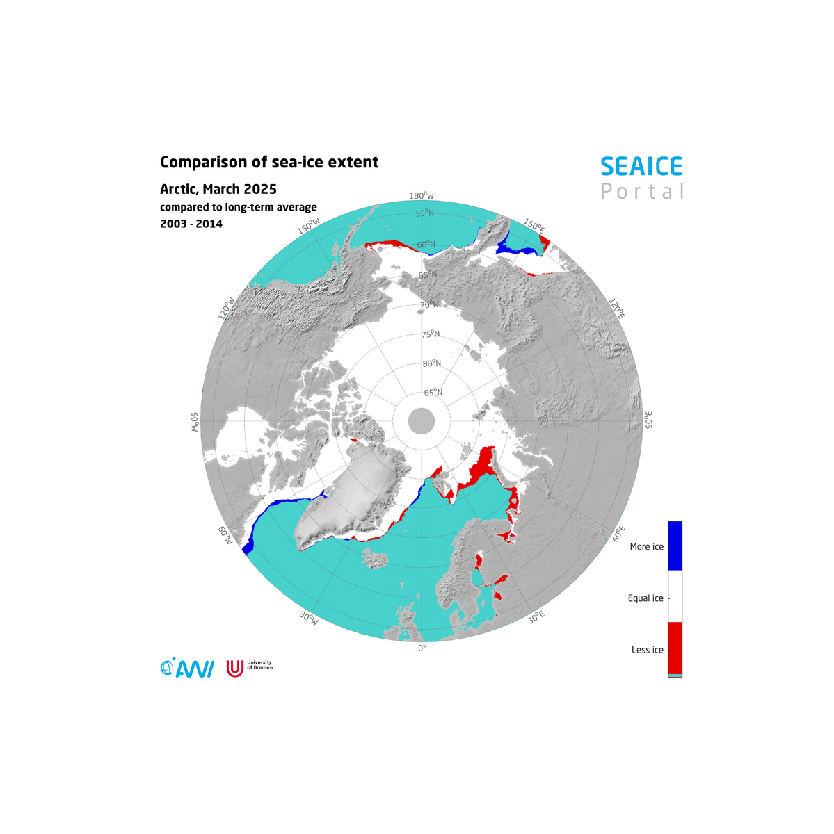 The winter growth period for sea ice in the Arctic Ocean is now over, with levels at a record low. The winter ice extent on 21 March 2025 was lower than at any time since continuous satellite recording began in 1979. At 14.45 million square kilometres, winter sea ice cover is over a million square kilometres below the long-term average. As in February 2025, average Arctic sea ice cover remained at an all-time low for the entire month of March, equalling the previous low set in 2017.