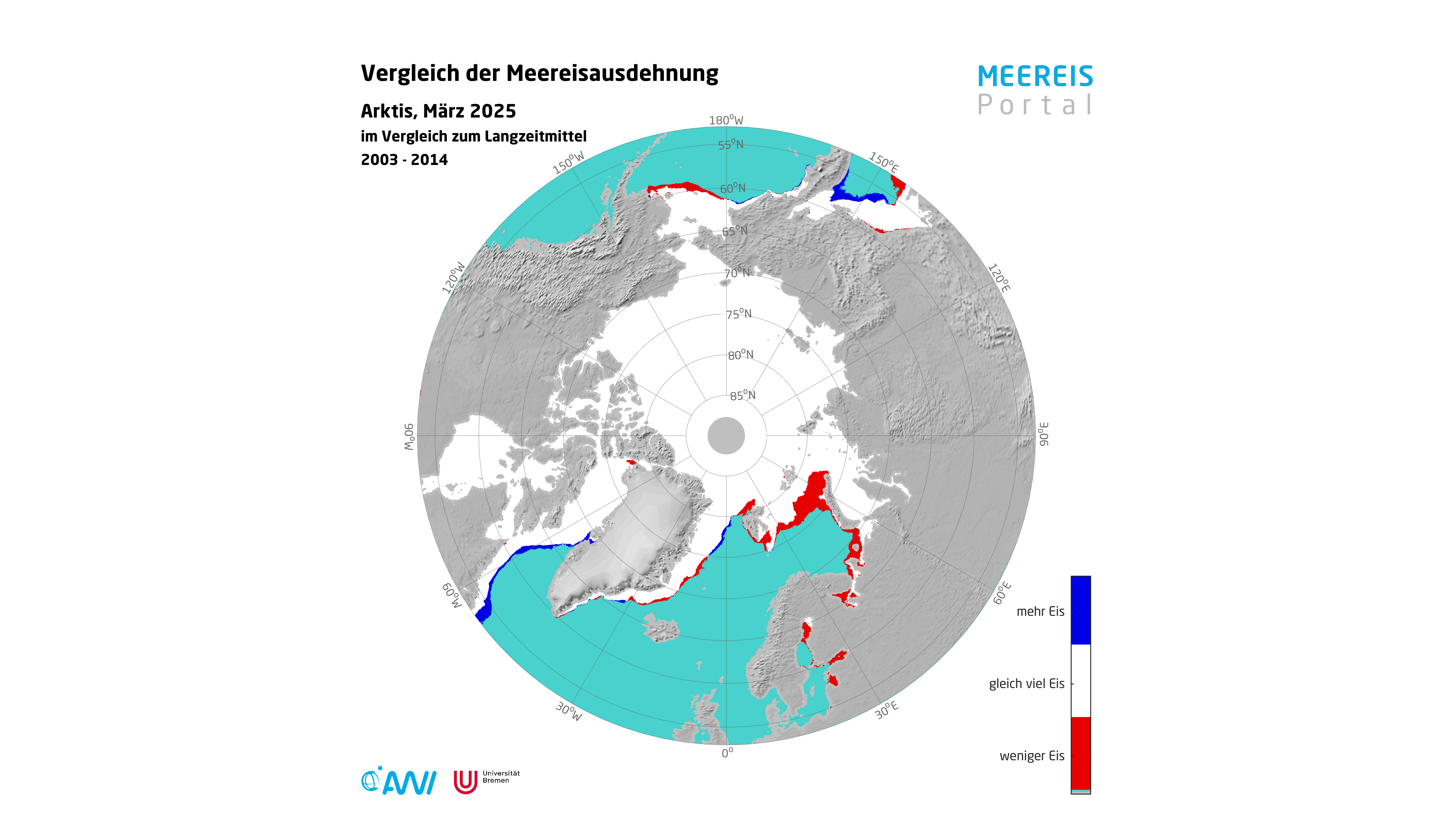 Auch der Mittelwert des Monats März 2025 stellt mit 14,21 Millionen Quadratkilometern einen Negativrekord dar, wie das Meereisportal vom Alfred-Wegener-Institut und der Universität Bremen jetzt analysiert hat. Im Aufzeichnungszeitraum seit dem Jahr 1979 gab es nur im Jahr 2017 so wenig Meereis im März wie aktuell. Eine offensichtliche Ursache für das wenige Meereis sind die im Vergleich zum langjährigen Mittel hohen Lufttemperaturen, die den Winter über in der Arktis auftraten.