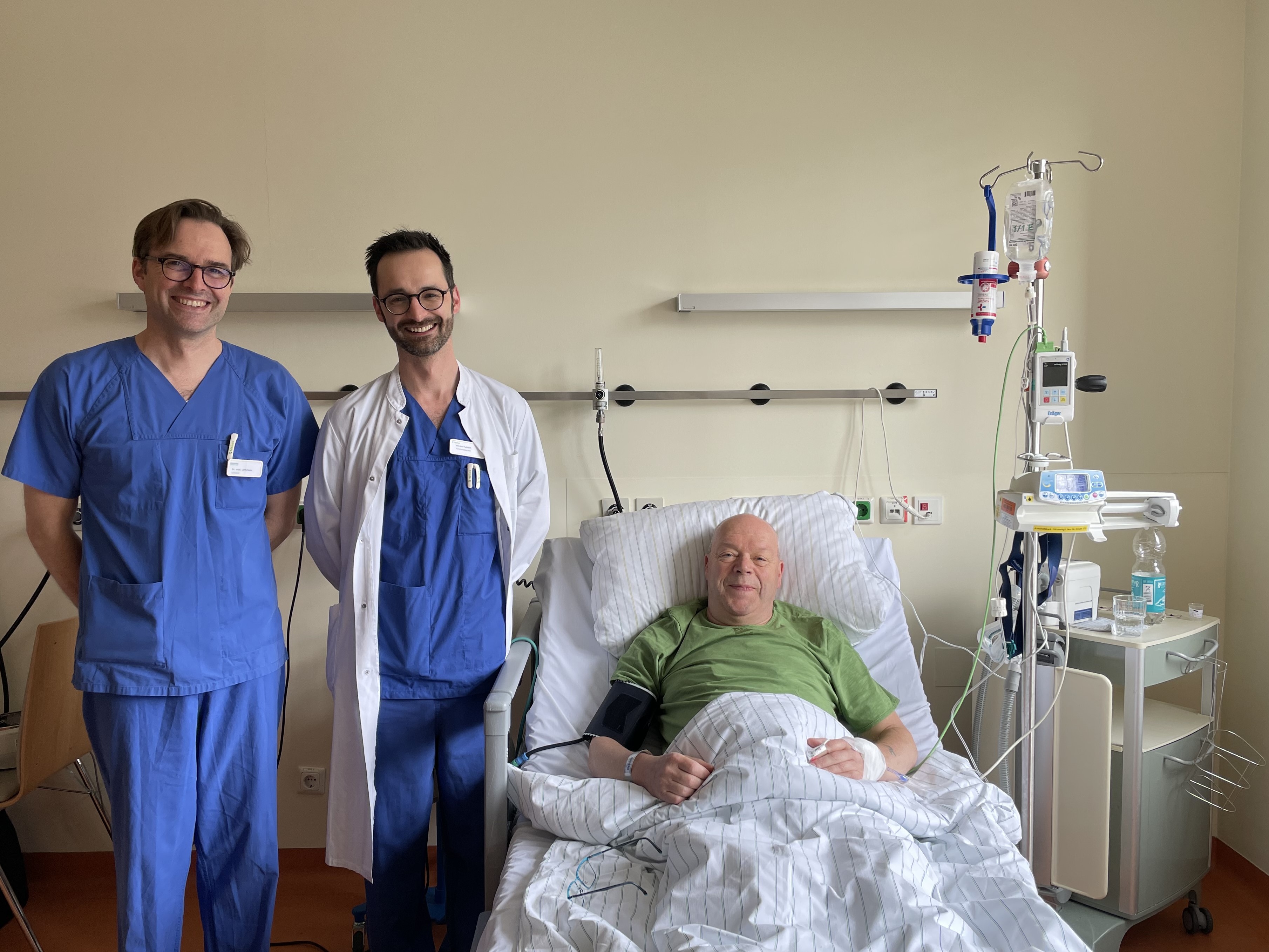 - Foto 1: Dr. med. Florian Löffelbein (Oberarzt Kinderkardiologie | Herzzentrum Leipzig) und Florian Vollrath (Funktionsoberarzt Allgemein, Viszeral- und Thoraxchirurgie | Helios Park-Klinikum Leipzig) mit Patient Andreas Theil (v.l.n.r.).
