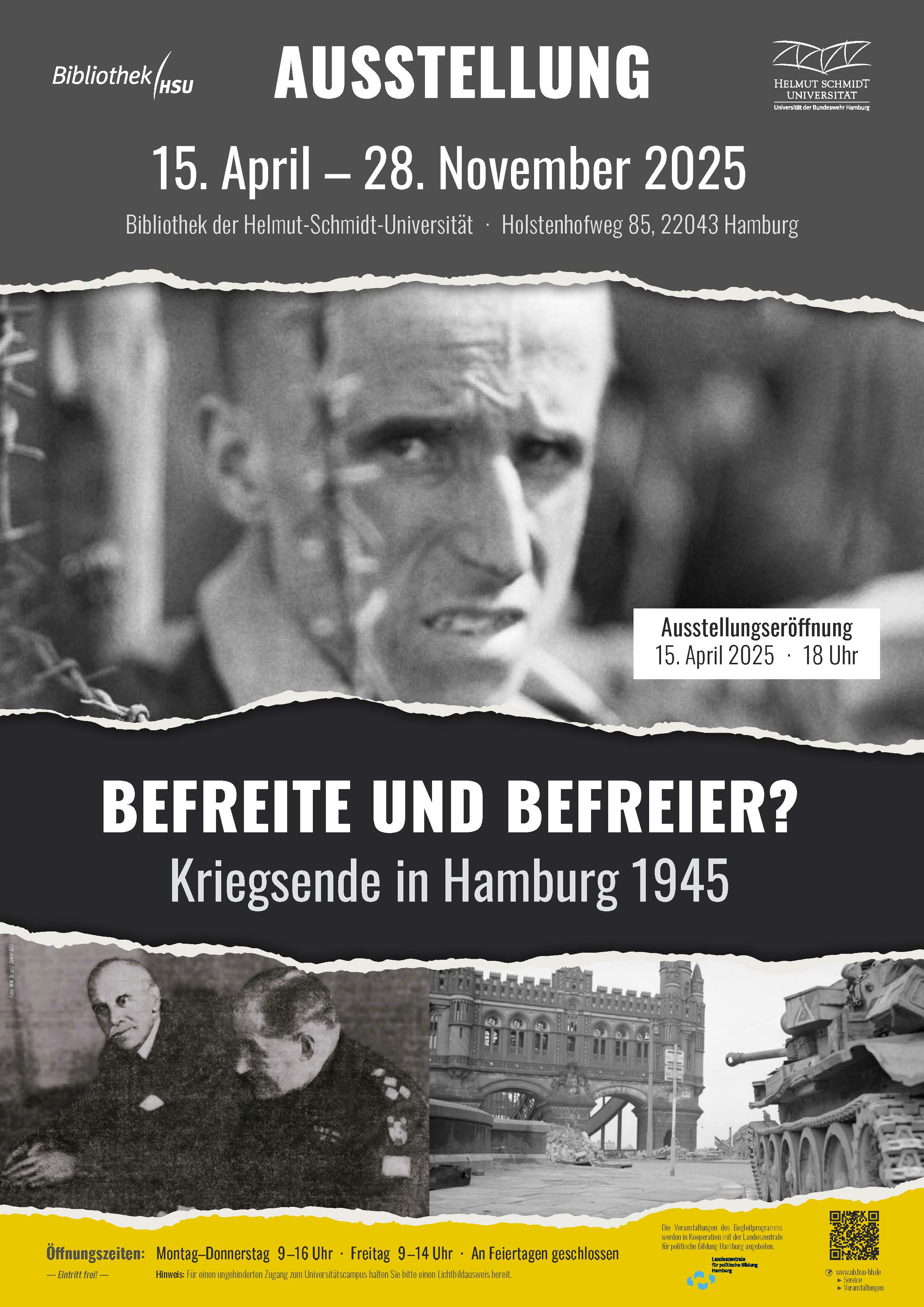 80 Jahre nach dem Ende des Zweiten Weltkriegs im Mai 1945 präsentiert die Bibliothek der Helmut-Schmidt-Universität/Universität der Bundeswehr Hamburg die Ausstellung „Befreite und Befreier? Kriegsende in Hamburg 1945“. Sie wird vom 15. April bis 28. November 2025 bei uns im Hause gezeigt.