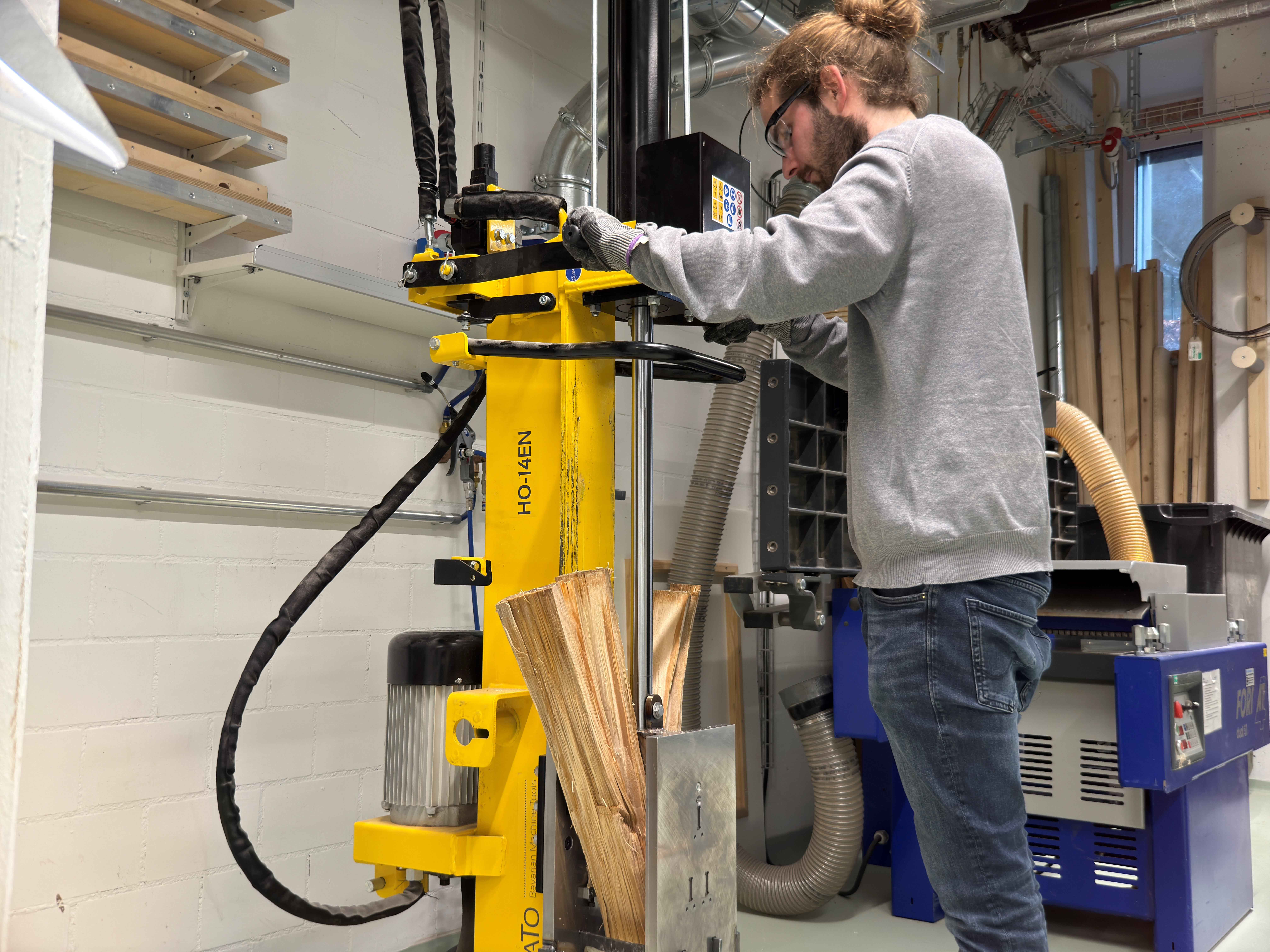 Traditionell werden Schindeln aus Holzstammsegmenten von Hand gespalten, industrielle Verfahren setzen auf pneumatische Spaltwerkzeuge. «Die Schindelherstellung zeigt uns, wie Holz energieeffizient und materialeffizient verarbeitet werden kann», erklärt Burgert. «Holz lässt sich parallel zur Faser mit minimalem Energieaufwand und praktisch ohne Verluste spalten.» Diese spanlose Holzverarbeitung erhöht die Schnittholz-Ausbeute erheblich, die in Schweizer Sägereien mit etwa 60% deutlich geringer ist.