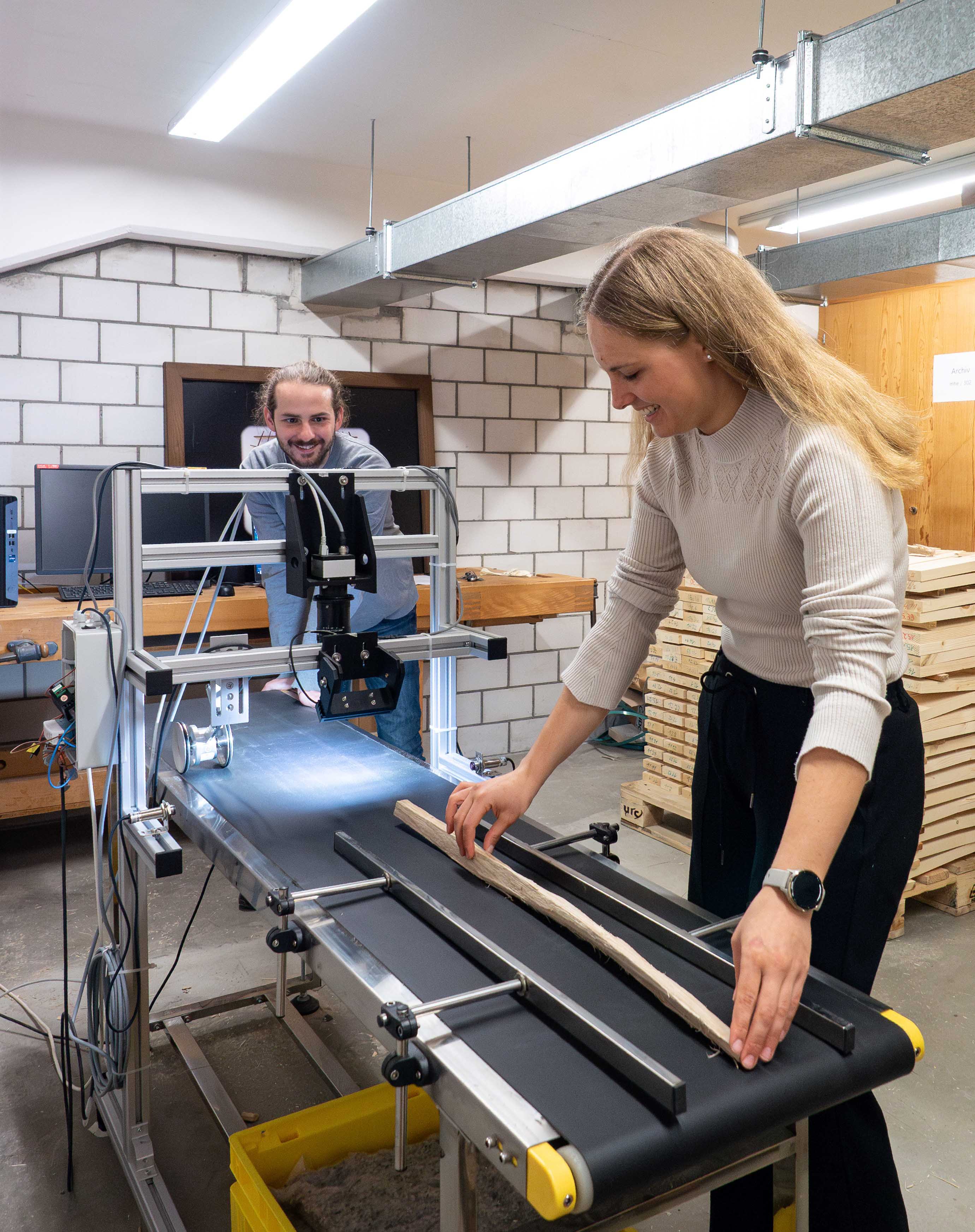Der Spaltprozess produziert Holzstäbe in Faserrichtung, ohne dass die steifen und festen Fasern angeschnitten werden. Die unregelmässige Form der Stäbe stellt jedoch eine Herausforderung dar. Um diese zu bewältigen, setzt das Team um Ingo Burgert auf künstliche Intelligenz (KI). Ein automatisiertes Kamerasystem erfasst hochaufgelöste Bilder jedes Holzstabs, die in ein neuronales Netzwerk eingespeist werden. «Mit künstlicher Intelligenz können wir wichtige Holzeigenschaften wie Steifigkeit für jeden Stab bestimmen, unabhängig von Form, Grösse oder Holzart», erklärt Empa-Forscher Mark Schubert. «Wenn wir in Zukunft verschiedene Holzarten unterschiedlicher Qualitäten verwenden, kommt der Holzsortierung eine besondere Rolle zu. Mit unseren maschinellen Lernalgorithmen generieren wir deshalb möglichst viele Daten über jedes einzelne Stück Holz, um es optimal für Holzwerkstoffe mit definierten Eigenschaften einzusetzen.»