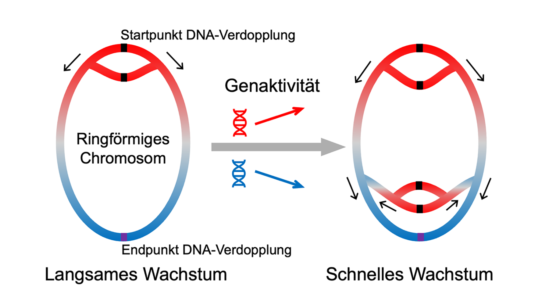 Bei der Verdopplung des bakteriellen Chromosoms liegen Gene nahe dem Startpunkt der DNA-Verdopplung (rot) in mehreren Kopien vor, während Gene nahe dem Endpunkt (blau) nur einfach vorhanden sind. Je schneller das Wachstum, desto stärker wird dieser Effekt: Gene nahe dem Ursprung können dann gleichzeitig von bis zu acht Kopien abgelesen werden. Abhängig davon, wie stark der Bedarf an einem bestimmten Gen mit der Wachstumsrate zunimmt, verschiebt die natürliche Selektion das Gen an eine passende Stelle auf dem Chromosom, um diesen Dosiseffekt auszunutzen. (Abbildung: HHU / Xiao-Pan Hu)
