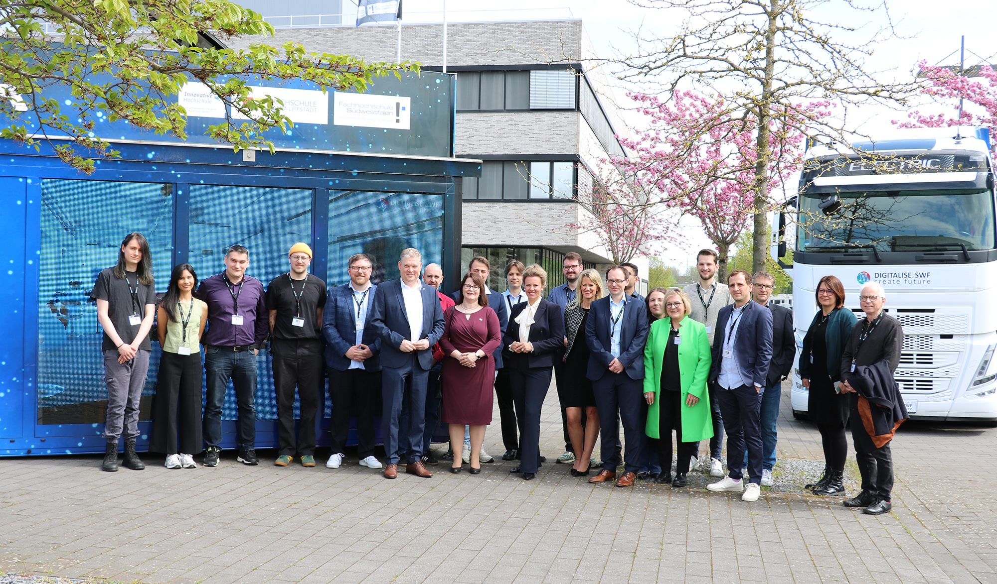Bereits im Oktober 2023 war Ministerin Brandes auf dem Campus zu Gast und hat dabei einen Prototyp des Trucks sehen können. Seit dem Sommer 2024 ist das "Lab-on-Tour" als mobile Wissenschaftsplattform in Südwestfalen unterwegs und hält auf Marktplätzen, Schulhöfen und bei Transferveranstaltungen. Wechselnde digitalisierungs- und forschungsbasierte Projekte der Hochschule Hamm-Lippstadt und der im Projekt "Digitalise_SWF" ebenso beteiligten Fachhochschule Südwestfalen laden ein Publikum von groß bis klein zum Ausprobieren und zum Austausch ein. Die Details des Projekts erklärten der HSHL-Vizepräsident für Forschung und Transfer, Prof. Dr.-Ing. Klaus Pantke und die Projektkoordinatorin Dr. Silke Glogowski. Es soll die Digitalisierungskompetenz in der Region stärken und insbesondere auch kleinen und mittelständischen Unternehmen zu Gute kommen, die wesentlich vom Digitalisierungswissen der Hochschulen profitieren können. Sieben "Virtuelle Institute" bündeln die Expertise von Forschenden in Bereichen wie intelligente Fertigung, Entrepreneurship, Lichttechnik und weiteren.