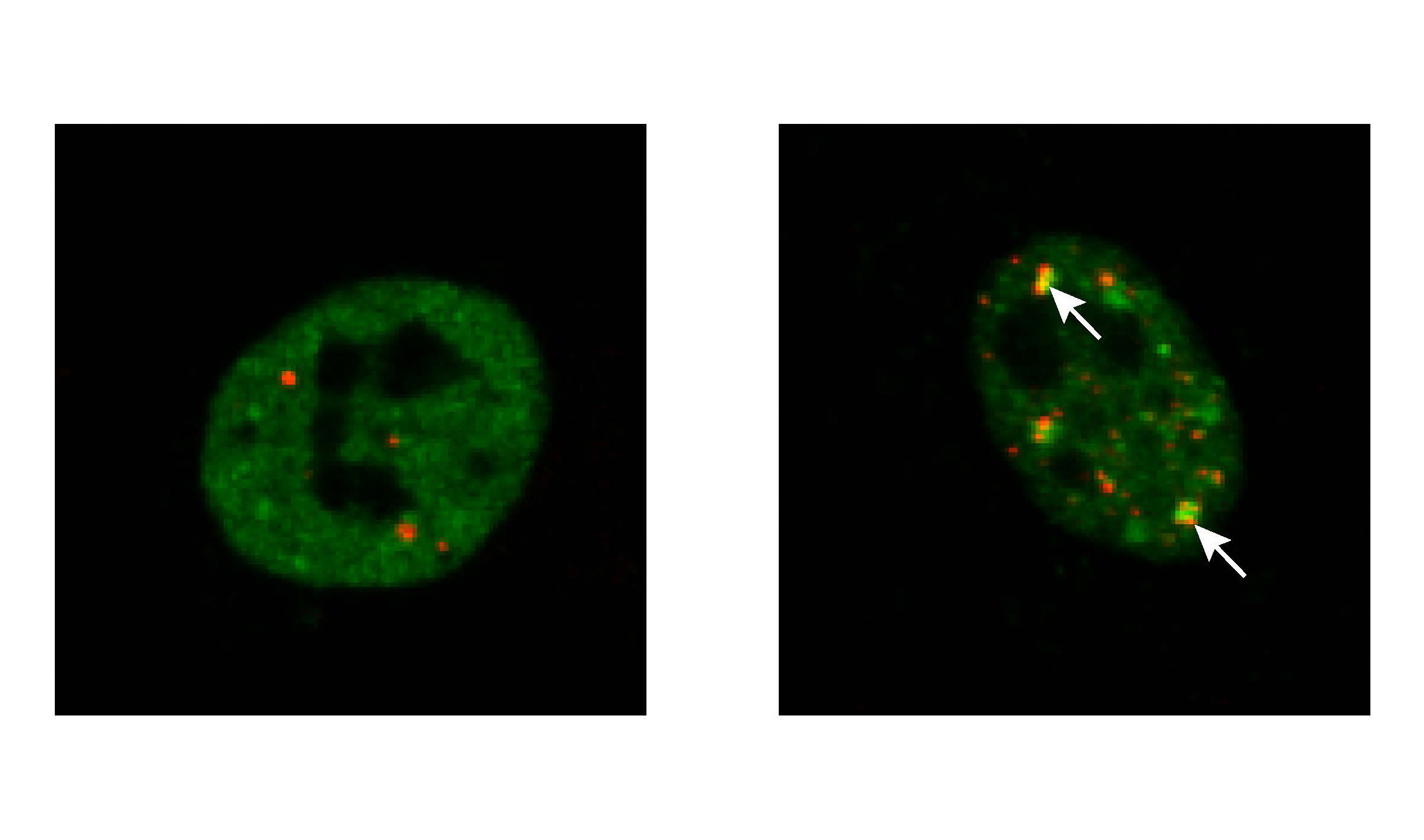 Die fluoreszenzmikroskopischen Aufnahmen zeigen Kerne kultivierter menschlicher Zellen: Links ist das Protein TDP 43 (grün) sichtbar verteilt im Zellkern gemeinsam mit Kernkörperchen (rot), die als Reparaturwerkstätten fungieren. Ist durch Stress oder Mutationen geschädigtes TDP-43 mit SUMO-Proteinen gekoppelt (rechtes Bild), wird es zu den Kernkörperchen transportiert (Pfeile) und so vor Verklumpung geschützt (Aufnahme: Dr. Jan Keiten-Schmitz).