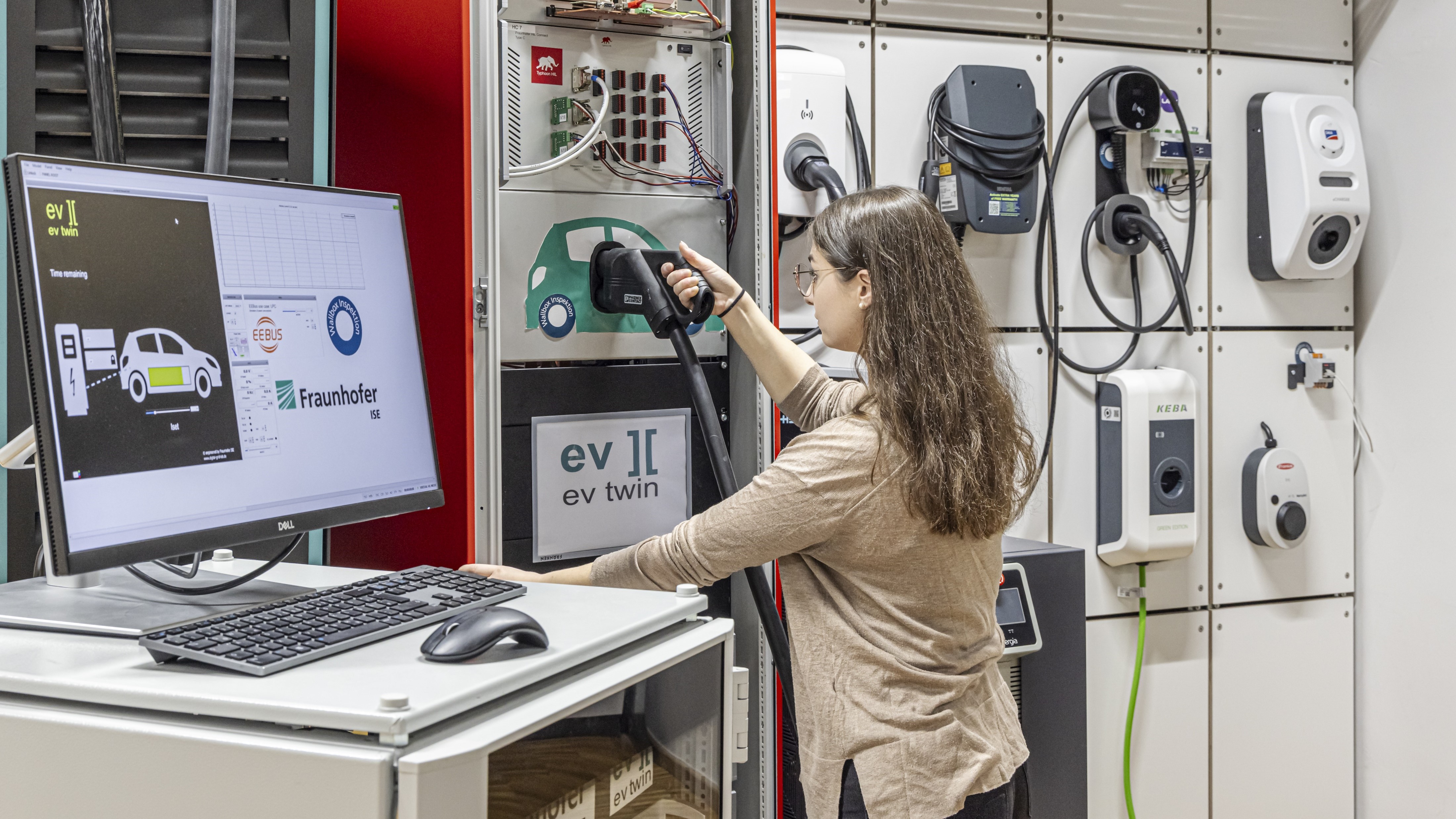 überwacht dabei über das Energy Meter den Netzanschluss und steuert über die Wall-box das Elektrofahrzeug. Für das Testen der Ladestation kamen keine echten Fahrzeuge zum Einsatz, sondern der digitale Fahrzeug-Zwilling »ev twin« des Fraunhofer ISE, der das Verhalten von 5.000 verschiedenen E-Autos simulieren kann. Dies bietet den Vorteil, dass nach dem Ladetest für einen weiteren Test kein Fahrzeug leergefahren werden muss. Stattdessen wird der Leistungsfluss mit bidirektionalen Netzteilen emuliert. Weiterer Vorteil: die Einflüsse verschiedener Laderegler im Fahrzeug sind eliminiert.