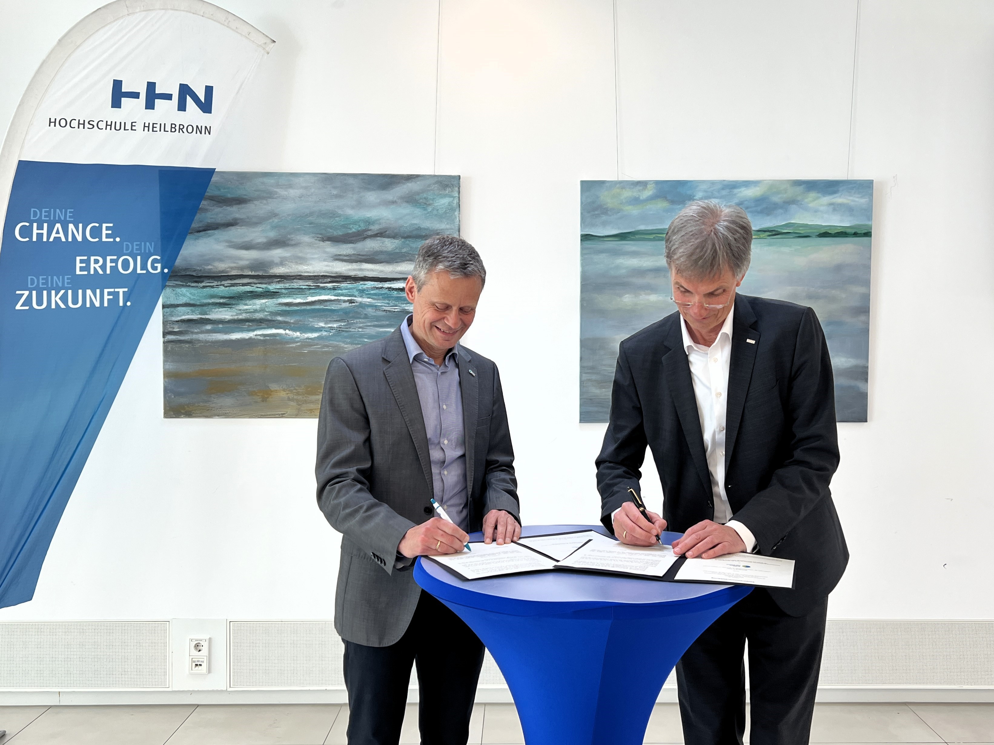 Oliver Lenzen, Rektor der HHN und Dr. Bernd Welz, Vorstandsvorsitzender der KLIMA ARENA, unterzeichneten im Anschluss an den Vortrag im Rahmen der Earth Week die Kooperationsvereinbarung. Dr. Bernd Welz bekräftigt die Freude über die Zusammenarbeit: „Mit der Hochschule Heilbronn bauen wir unser Partner-Netzwerk aus und freuen uns sehr, erstmalig eine Kooperation mit einer Hochschule aus der Region einzugehen. Mit unseren vielfältigen Angeboten und Programmen stehen wir bereit, um diese ergänzend auf ihrem Weg zu einer Kultur der Nachhaltigkeit tatkräftig zu unterstützen und zu begleiten.“