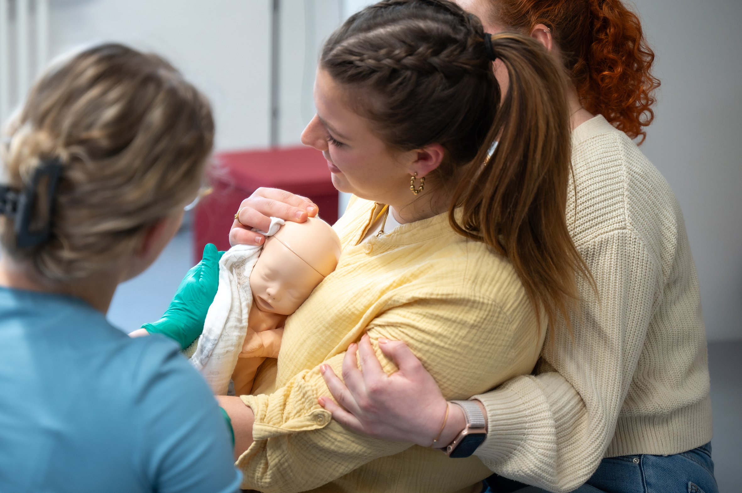 „Während des gesamten Studiums sind mehr als 400 Unterrichtseinheiten für Übungen und Simulationen vorgesehen“, erklärt Prof. Dr. Sabine Striebich, Leiterin des Studiengangs Hebammenwissenschaft am Institut für Gesundheits-, Hebammen- und Pflegewissenschaft. „Am Anfang sind es Fertigkeitstrainings, zum Beispiel wie man den Bauch einer Schwangeren abtastet oder zu Beschwerden berät. In den höheren Semestern werden komplexe interprofessionelle Simulationen durchgeführt, bis hin zu Notfallszenarien wie Schulterdystokie und verstärkter Blutung nach der Geburt, die in der Praxis nur schwer geübt werden können. Wenn die Studierenden nach der Vorlesungszeit in die Praxis gehen, wissen sie, auf was es bei der Kommunikation und Kooperation ankommt.“