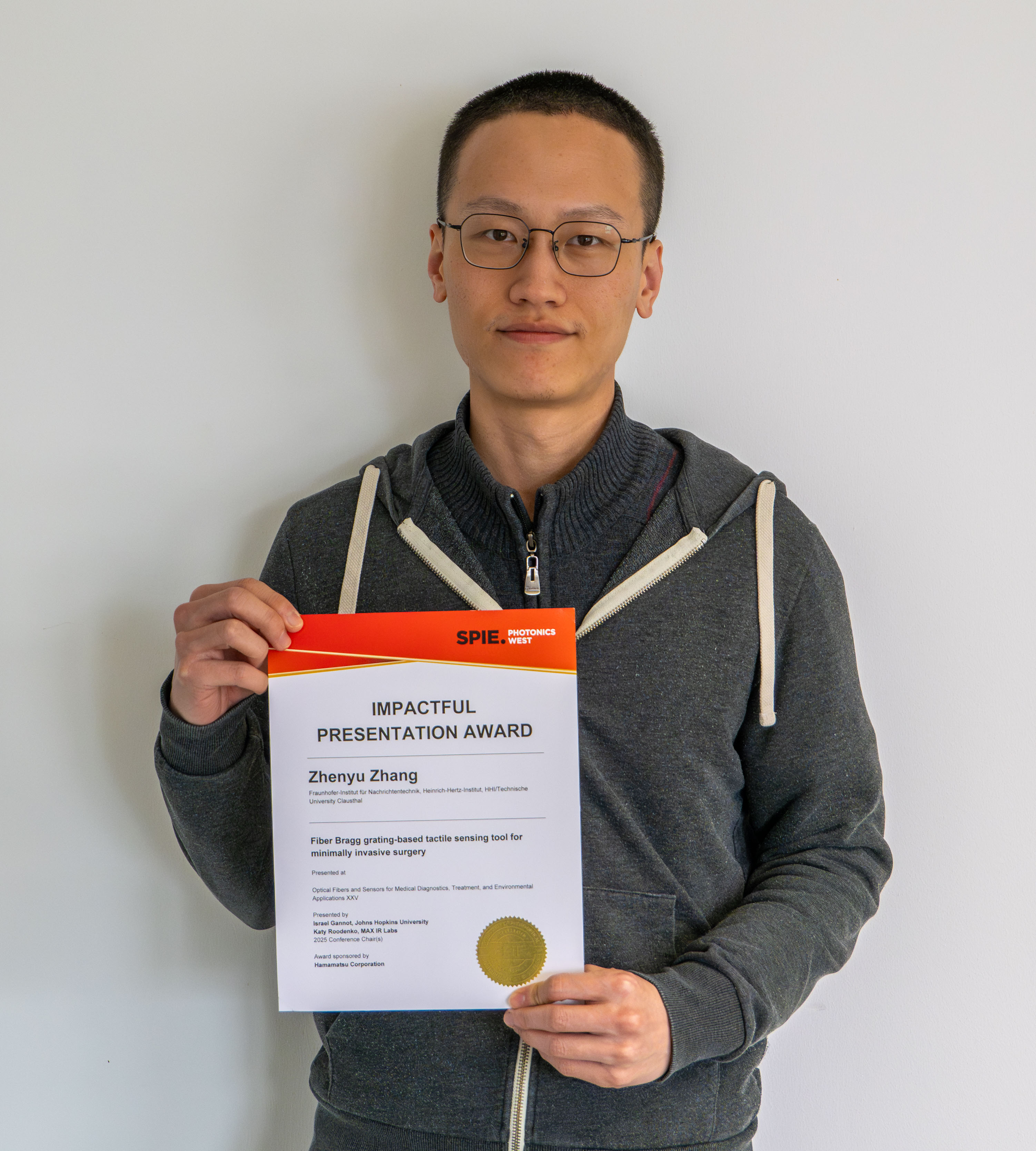 Zhenyu Zhang, research associate at Fraunhofer Heinrich-Hertz-Institut (HHI), received the Impactful Presentation Award at Photonics West 2025. His recognized contribution presents significant advances in fiber optic tactile sensing for minimally invasive surgery. The research was carried out as part of Palpable, an EU-funded project aimed at transforming the European healthcare industry through innovations in photonics, multi-sensor technologies, and soft robotics.
