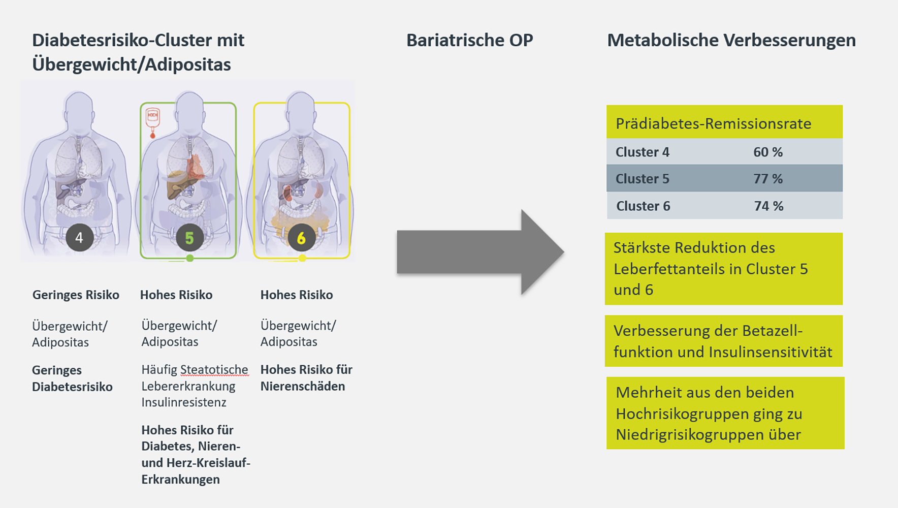 • Die Hochrisiko-Untergruppen 5 und 6 profitierten stärker von der bariatrischen Chirurgie in Bezug auf Insulinresistenz, Beta-Zell-Funktion und Prädiabetes-Remission.