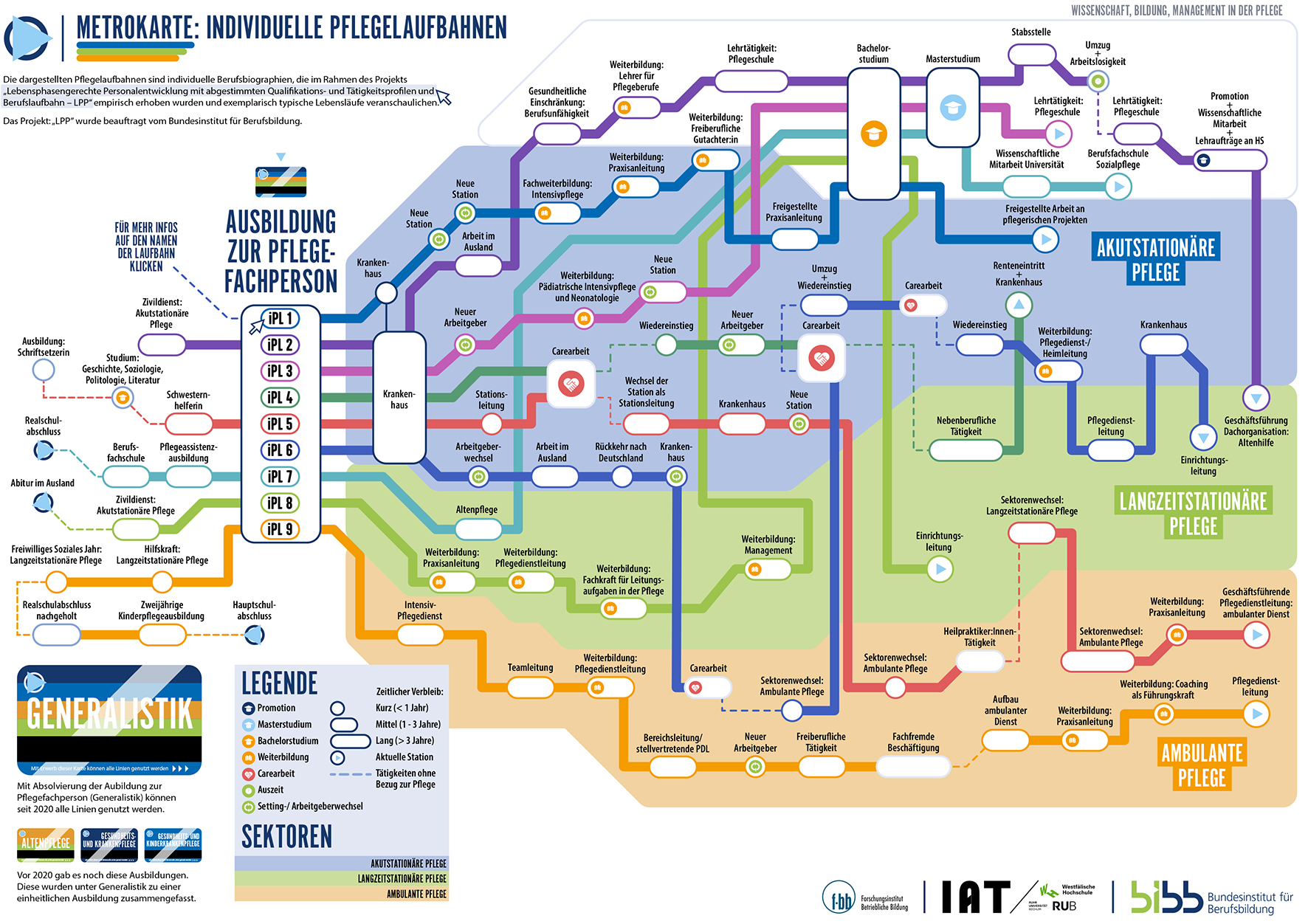„Unsere Metrokarte zur Pflegelaufbahn verdeutlicht, dass es nicht den einen linearen Karriereweg gibt. Stattdessen eröffnen sich vielfältige Entwicklungsmöglichkeiten, die individuell und situativ gestaltet werden müssen“, erläutert Dr. Barbara Kiepenheuer-Drechsler (f-bb), Projektleitung des Forschungskonsortiums.