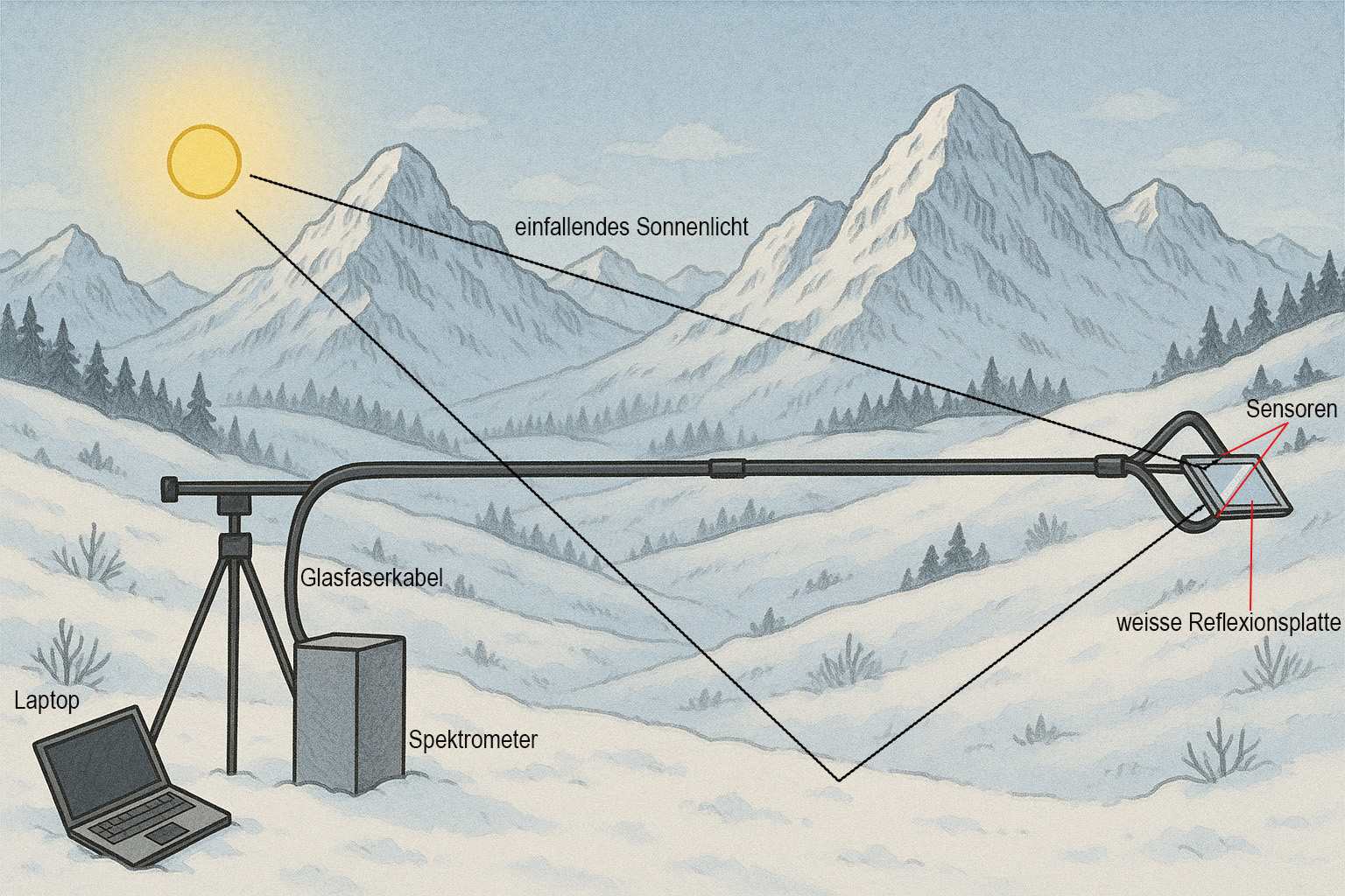 Der Clou dabei: Die Schneeoberfläche reflektiert nicht jede Wellenlänge gleich stark. Dadurch verändert sich das Lichtspektrum bei jeder Reflexion. Das bedeutet, die Intensität bestimmter Wellenlängen wird mit der Zeit stärker als im einfallenden Licht. «Ich möchte herausfinden, wie sich die Spektren an unterschiedlichen Orten wie Südhang, Nordhang und Mitte unterscheiden», beschreibt Mödl ihr Ziel. Ihre Messungen sollen dazu beitragen, PV-Anlagen so zu optimieren. dass sie auch das reflektierte Licht von benachbarten Hängen nutzen. Denn am idealen Standort und richtig ausgerichtet produzieren sie in den Wintermonaten noch effektiver Strom als heute.