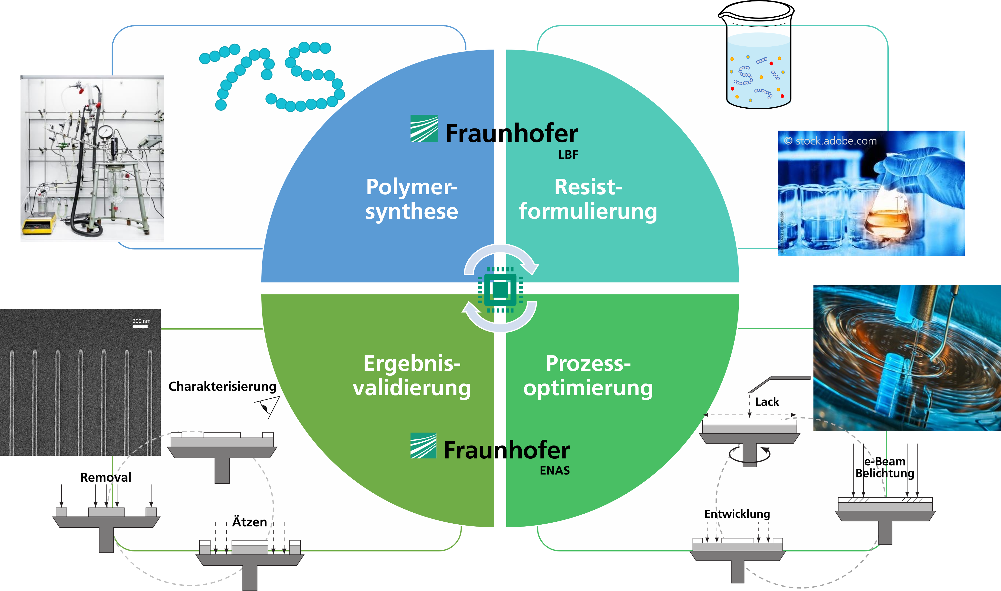 Am Fraunhofer-Institut für Elektronische Nanosysteme ENAS wird die Integration der neu entwickelten Resiste in Prozesse entlang der gesamten Halbleiterproduktionskette erfolgen. Gleichzeitig werden die Einsatzmöglichkeiten der sensitiven und hochauflösenden Resiste in wichtigen Zukunftsthemen wie der Sensorik, dem Quantencomputing und der Photonik vorangetrieben. Durch die ausführliche Charakterisierung der im Projekt entwickelten Lacke hinsichtlich ihrer Performance in lithografischen Prozessschritten, dem weiterführenden Strukturübertrag in verschiedenste Materialien mittels Ätzen und der abschließenden Lackentfernung wird eine für die Industrie attraktive Technologieplattform aufgebaut.