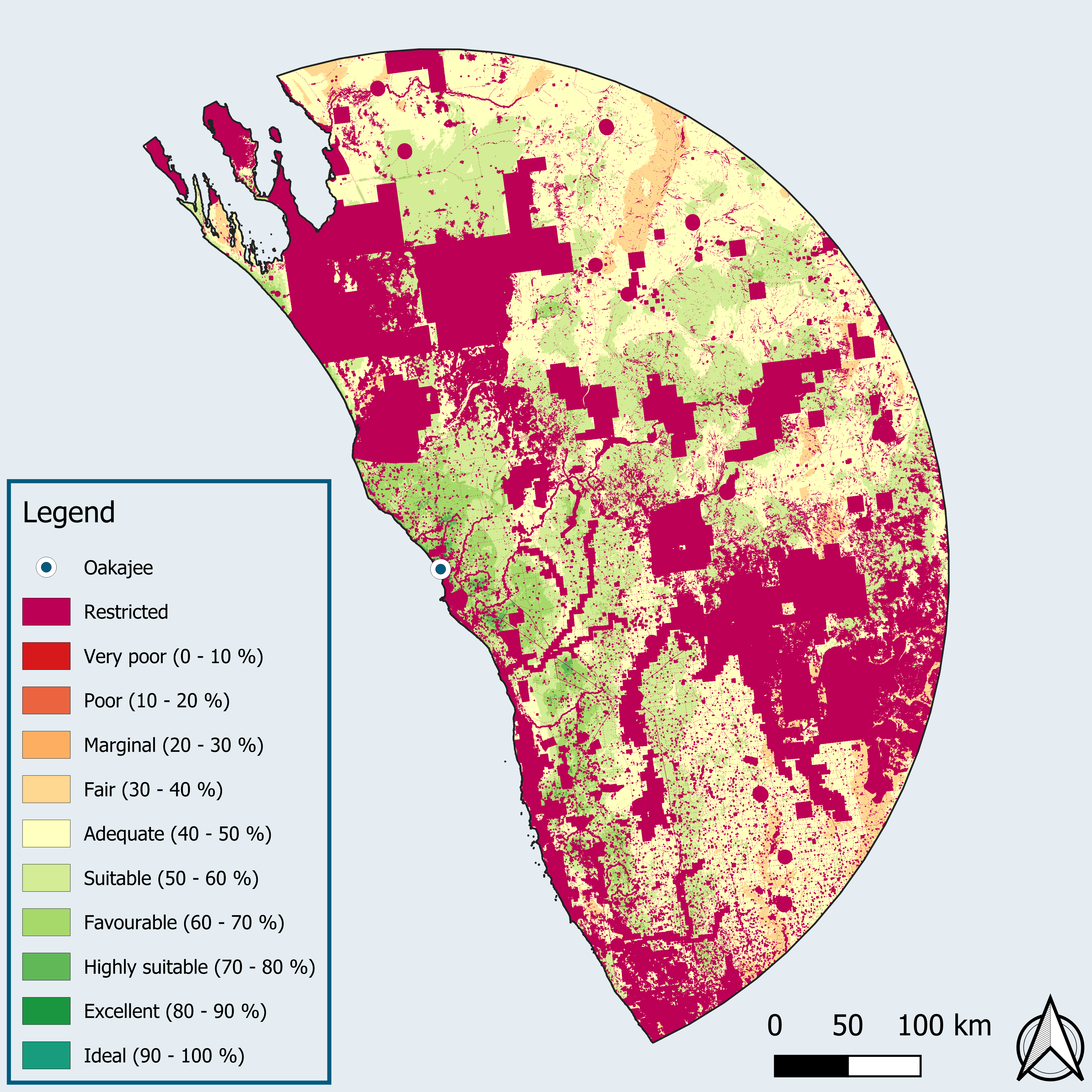 Mit seiner strategischen Lage und seinem Potenzial im Bereich der erneuerbaren Energien ist der »Mid West Hydrogen Hub« um das geplante Industriegebiet Oakajee ein zentraler Knotenpunkt für das Wachstum der erneuerbaren Industrie in Westaustralien. Der Ort wurde auch als potenzieller Standort für einen großen Tiefseehafen identifiziert. Die »TrHyHub«-Studie untersuchte die technische Auslegung, den Standort und die Machbarkeit einer Ammoniak-Exportinfrastruktur im Hafen von Oakajee. Eine vom Fraunhofer ISE durchgeführte Standortanalyse (Geografisches Informationssystem-Analyse) ergab, dass das Land in einem Umkreis von 350 Kilometern um die geplante Industriezone Oakajee ein erhebliches Potenzial für die Stromerzeugung aus erneuerbaren Energien in großem Maßstab bietet. Das Gebiet ermöglicht theoretisch eine maxi-male Stromproduktion von 10.000 Terawattstunden (TWh) aus Photovoltaik und 5.700 TWh aus Onshore-Windenergie. Bei vollem Ausbau bedeutet dies eine theoretische Wasserstoffproduktion von 185 Millionen Tonnen pro Jahr (Mtpa) aus Solarenergie und 105 Mtpa aus Windenergie. Eine Wasserstoffproduktion in dieser Größenordnung würde einen erheblichen Teil des europäischen Wasserstoffbedarfs im Jahr 2050 decken. Die geplante Produktionskapazität für Ammoniak aus erneuerbaren Energien könnte mehr als 15 Mtpa erreichen, was der derzeitigen europäischen Ammoniakproduktion entspricht.