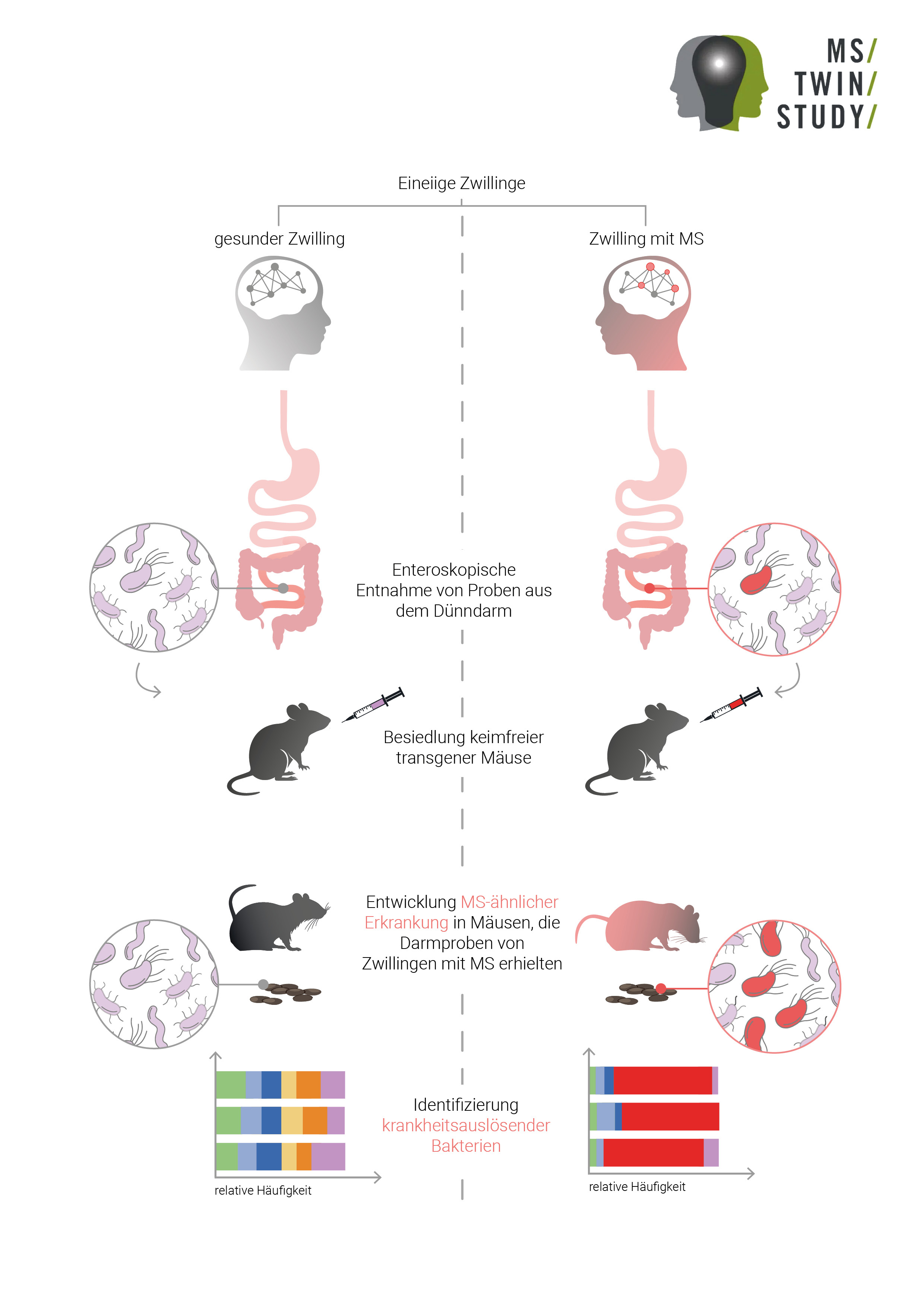 Etwa 100 solcher Zwillingspaare nehmen momentan an der MS TWIN STUDY am Institut für Klinische Neuroimmunologie des LMU Klinikums teil und ermöglichen, die Krankheit unter vergleichbareren Bedingungen zu untersuchen: Neben den geringen genetischen Unterschieden haben die Zwillinge bis ins frühe Erwachsenenalter zusammengelebt und waren somit ähnlichen Umweltfaktoren ausgesetzt.