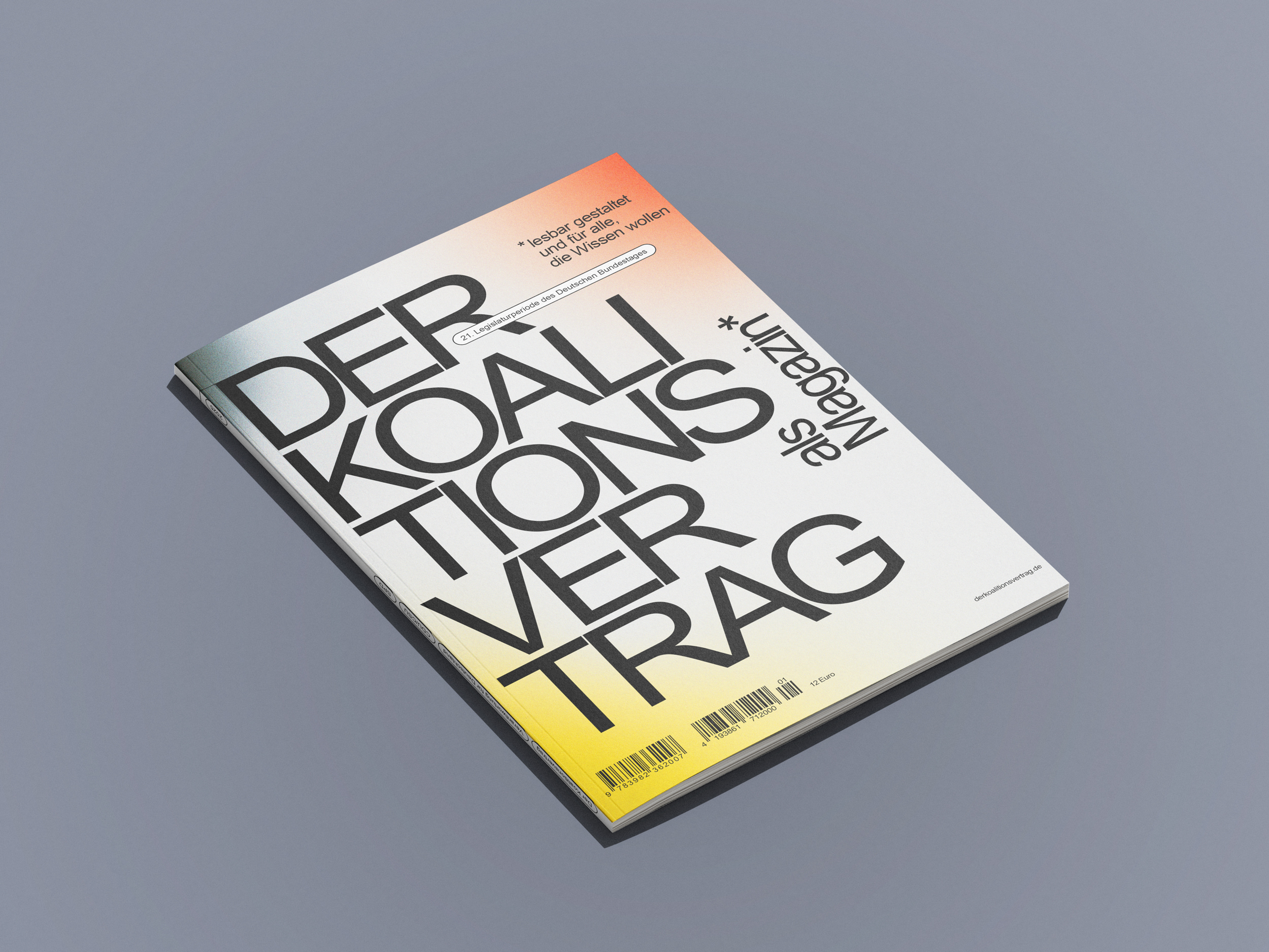 Der Koalitionsvertrag wurde von 3 Parteien in 6 Wochen mühevoll ausgehandelt. 4588 Zeilen Politik stecken da drin, natürlich im entsprechenden Duktus geschrieben, also mit zahlreichen Abkürzungen und Paragraphen. Als Magazin soll der Koalitionsvertrag nun allen Bürger*innen einen Zugang zu den Inhalten ermöglichen. „Lesbar gestaltet und für alle, die Wissen wollen“, steht auf dem Cover.