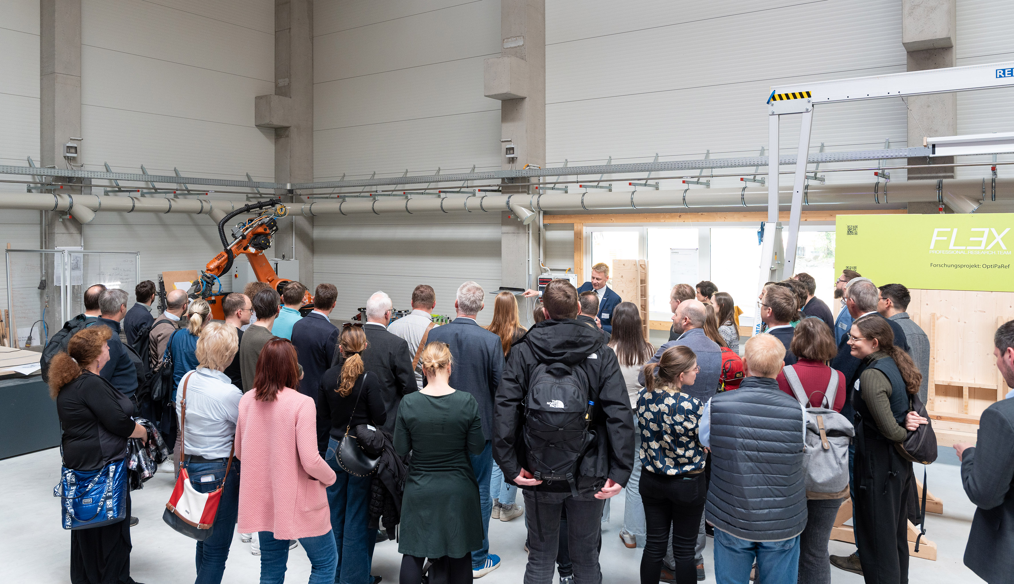 Im HolzBauForschungsZentrum der HTWK Leipzig feierte die Forschungsgruppe FLEX am Freitag mit 250 Gästen aus Wirtschaft, Wissenschaft und Politik ihr Jubiläum. Ein Jahrzehnt angewandte Forschung bildete den Anlass für das heutige Jubiläums-Fest der Forschungsgruppe FLEX der Hochschule für Technik, Wirtschaft und Kultur Leipzig (HTWK Leipzig). „Wir sind vor etwas mehr als zehn Jahren als interdisziplinäre Forschungsgruppe FLEX an den Start gegangen, um der angewandten Forschung auf dem Gebiet der digitalen Fertigung im Bauwesen neue Impulse zu verleihen“, sagte Alexander Stahr, Professor für Tragwerkslehre an der HTWK Leipzig sowie Gründer von FLEX in seiner Eröffnungsrede.