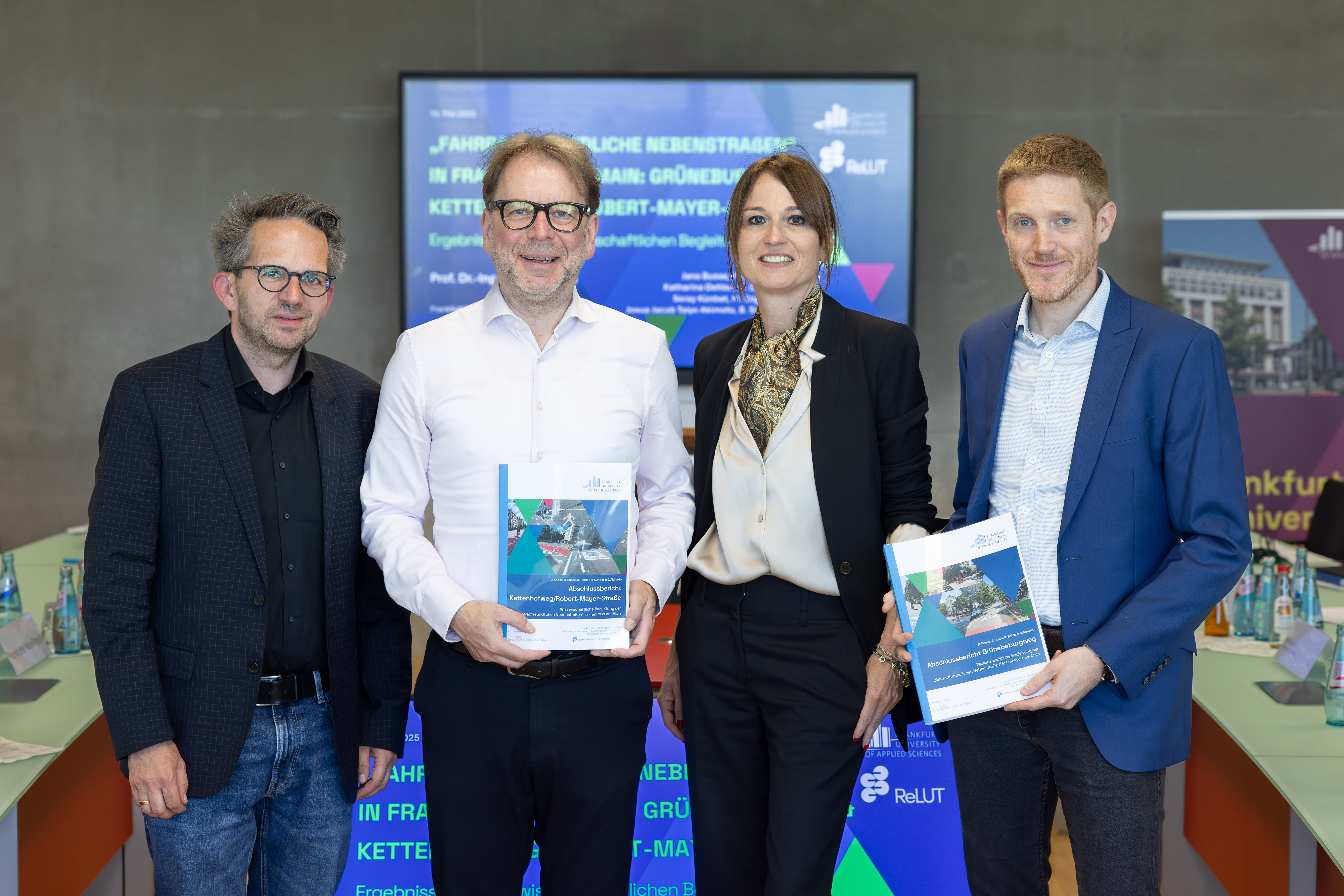 Zur Umgestaltung des Grüneburgwegs sowie der Achse Kettenhofweg/Robert-Mayer-Straße liegen die Abschlussberichte im Projekt „Fahrradfreundliche Nebenstraßen“ vor. (V.l.n.r.): Stefan Lüdecke, Büroleiter, Dezernat für Mobilität der Stadt Frankfurt a.M., Wolfgang Siefert, Mobilitätsdezernent der Stadt Frankfurt am Main, Prof. Dr. Susanne Rägle, Vizepräsidentin für Forschung, Transfer und Internationalisierung der Frankfurt UAS, Prof. Dr.-Ing. Dennis Knese, Professor für Nachhaltige Mobilität und Radverkehr, Frankfurt UAS.