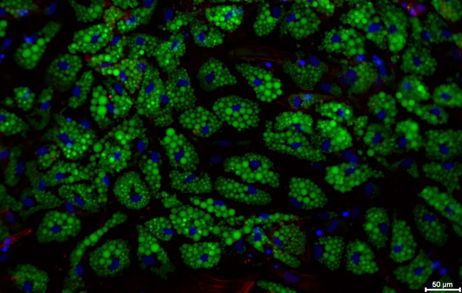 Adipositas ist ein Risikofaktor für Typ-2-Diabetes, bei dem der Körper zunächst die Fähigkeit verliert, auf das Blutzucker-senkende Hormon Insulin zu reagieren. In Folge schüttet die Bauchspeicheldrüse mehr Insulin aus, um die rückgehende Wirkung auszugleichen. Da Adipositas zunächst durch eine Zunahme der Fettmasse charakterisiert ist, interessierte uns in Augsburg die Frage, ob Fettzellen direkt mit der Bauchspeicheldrüse kommunizieren können, um die Insulinproduktion anzukurbeln. Wir konnten zeigen, dass dies tatsächlich möglich ist: Fettzellen senden sogenannte extrazelluläre Vesikel aus – winzige Bläschen, die Eiweiße, Fette oder genetische Informationen enthalten. Diese Vesikel können die Funktion der Bauchspeicheldrüse beeinflussen – etwa die Insulinproduktion steigern oder verändern.