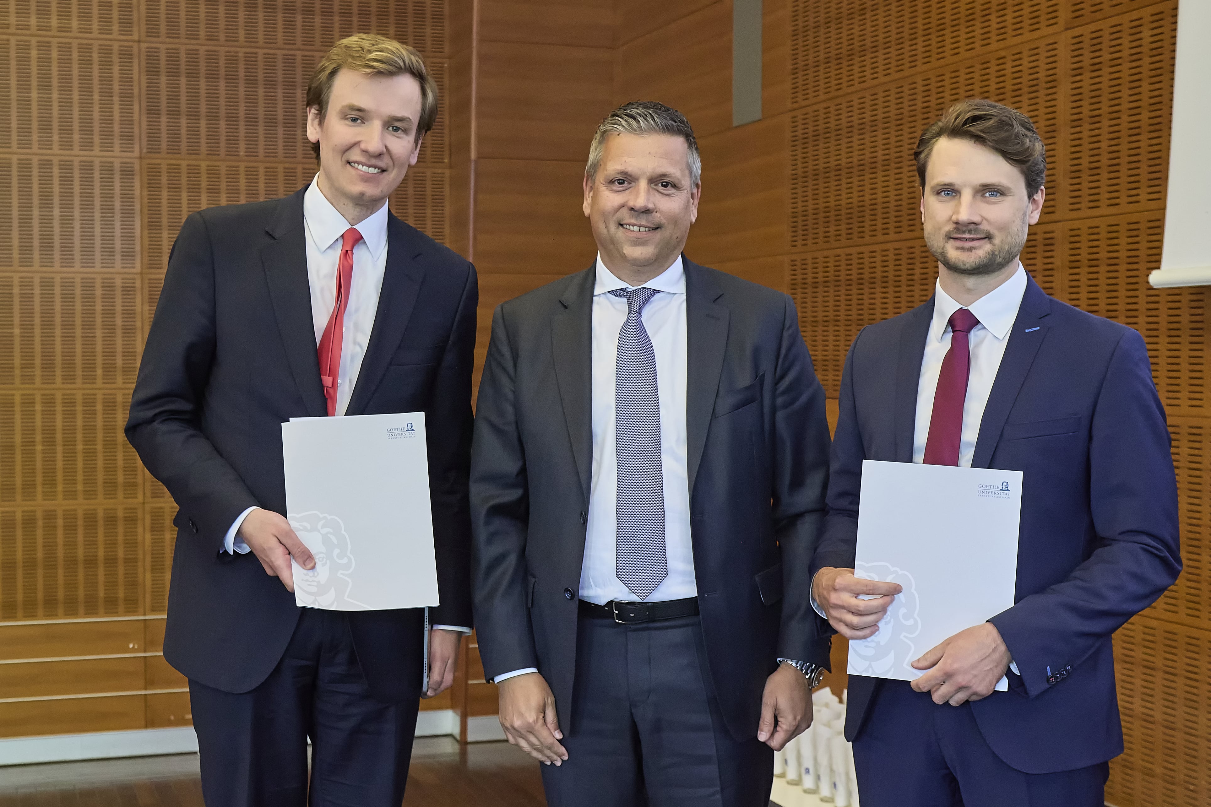 Am Fachbereich Rechtswissenschaft der Goethe-Universität werden herausragende Arbeiten mit Preisen ausgezeichnet. Der Baker McKenzie-Preis, der von der gleichnamigen Kanzlei verliehen wird, geht in diesem Jahr an Dr. Tobias Bürk und Dr. Kevin Hinzen für deren herausragende wirtschaftsrechtliche Doktorarbeiten.