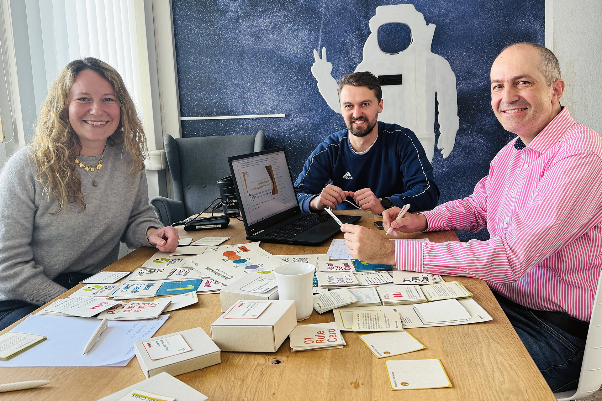 SDG steht für die „17 sustainable development goals” der Vereinten Nationen. Sie bieten seit 2015 eine Orientierungshilfe, wie wirtschaftliche und soziale Entwicklung Hand in Hand mit Klimaschutz funktionieren kann. Um sich über die Weiterentwicklung des Spiels auszutauschen, trafen sich nun Mitentwicklerin Katharina Pfeuffer (Innovationsmanagerin im Werk:Raum), Niklas Dekkers (wissenschaftlicher Mitarbeiter am Institut für angewandte Logistik (IAL) der THWS) und Prof. Dr. Harald Bolsinger von der THWS Business School, der das Spiel zukünftig insbesondere in internationalen Lehrformaten einbauen will.