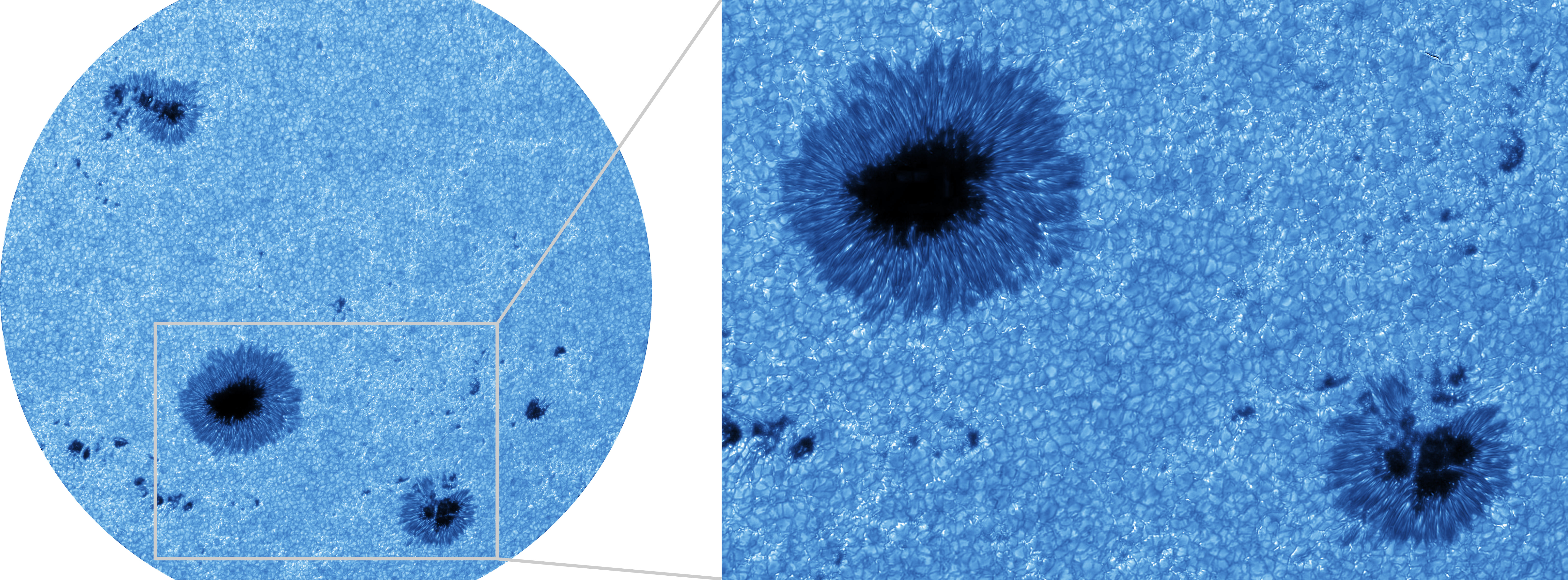 Die neuen Aufnahmen zeigen Bereiche, die etwa 1/7 des Sonnendurchmessers, also rund 200.000 km, entsprechen. Dadurch ist es möglich, auch großräumige Strukturen der aktiven Sonne wie Plasmaströme und Sonnenfleckengruppen zu beobachten. Großteleskope liefern im Vergleich dazu typischerweise nur Bildfelder von ca. 75.000 km Durchmesser. „Unsere Erwartungen an das Kamerasystem wurden auf Anhieb mehr als erfüllt,“ sagt Robert Kamlah, der das Projekt im Rahmen seiner Doktorarbeit am AIP und der Universität Potsdam durchführte. Die G-Band-Beobachtungen zeigten, wie die Sonnenflecken in die konvektiven Plasmabewegungen der Supergranulation eingebettet sind. Die nicht-radiale Ausrichtung und Verwindung der penumbralen Filamente offenbarte die komplexe Magnetfeldstruktur, die für drei große und viele kleine Strahlungsausbrüche in der aktiven Region verantwortlich war.