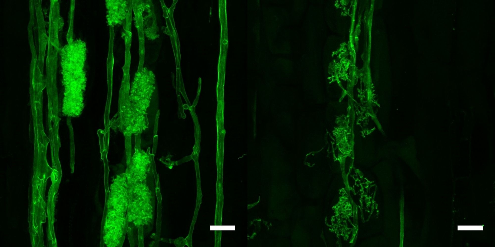 Im Zentrum dieses Nährstoffaustauschs stehen sogenannte Arbuskeln. Dabei handelt es sich um baumartige Pilzstrukturen in den Zellen der Wurzelrinde, die Mineralien wie Phosphat an die Pflanzenzelle abgeben und die von der Pflanze gelieferten Lipide aufnehmen. Sie sind von einer Pflanzenmembran umgeben, die voller Transportproteine ist, die die Mineralstoffe oder Lipide zum Symbiose-Partner leiten.