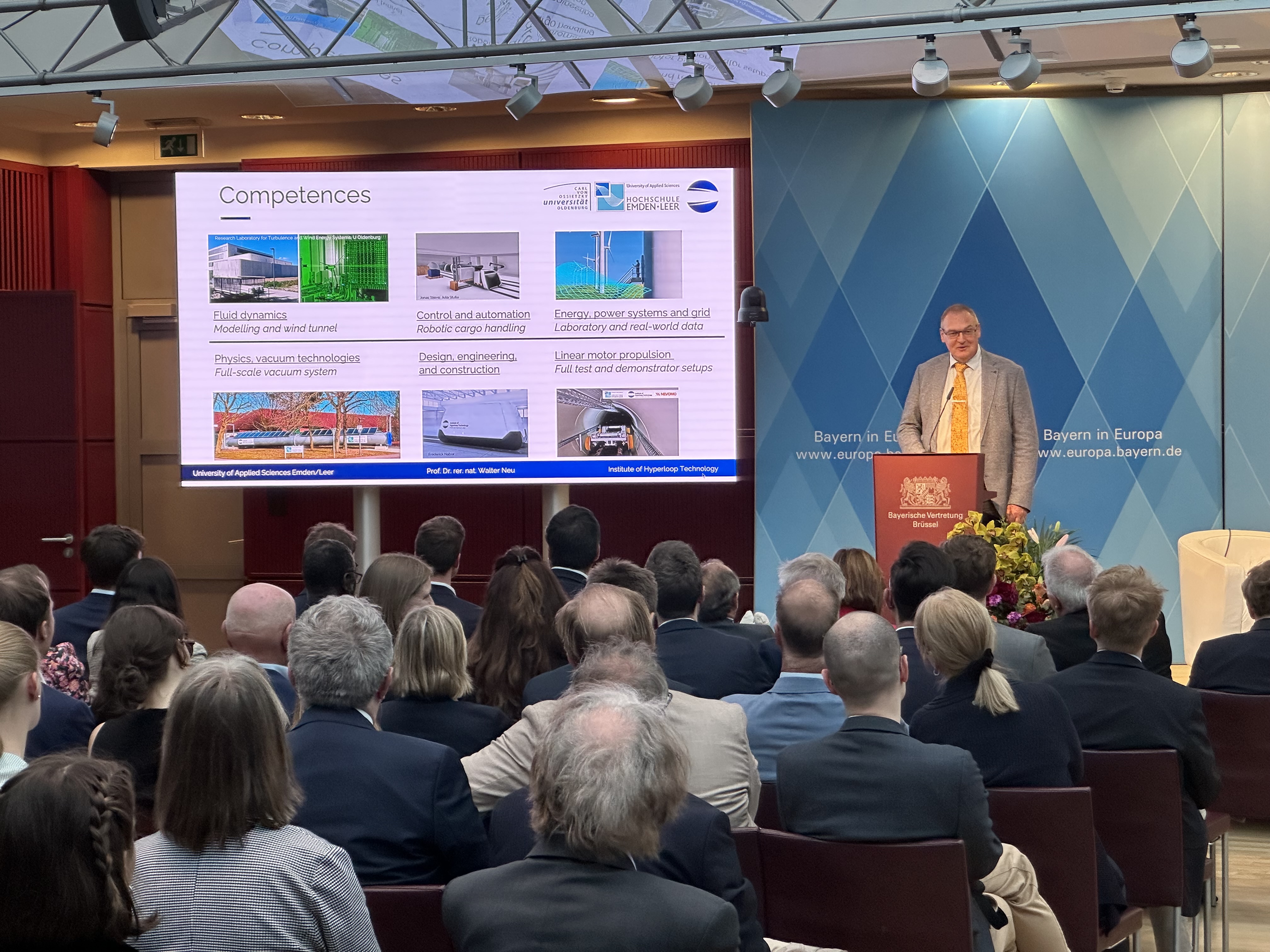 Die Vertretung des Freistaates Bayern bei der Europäischen Union in Brüssel hat in der vergangenen Woche eine Veranstaltung mit dem Titel „Hyperloop – Nachhaltige Verkehrstechnologie für die Zukunft“ ausgerichtet. Ziel war es, das Potential der Technologie und die Pionierarbeit der Technischen Universität Mün-chen (TUM) mit finanzieller Unterstützung der Bayerischen Staatsregierung vorzu-stellen. Unter den Vortragenden war auch Prof. Dr. Walter Neu, der über die goTube Forschungsinfrastruktur an der Hochschule Emden/Leer berichtete.