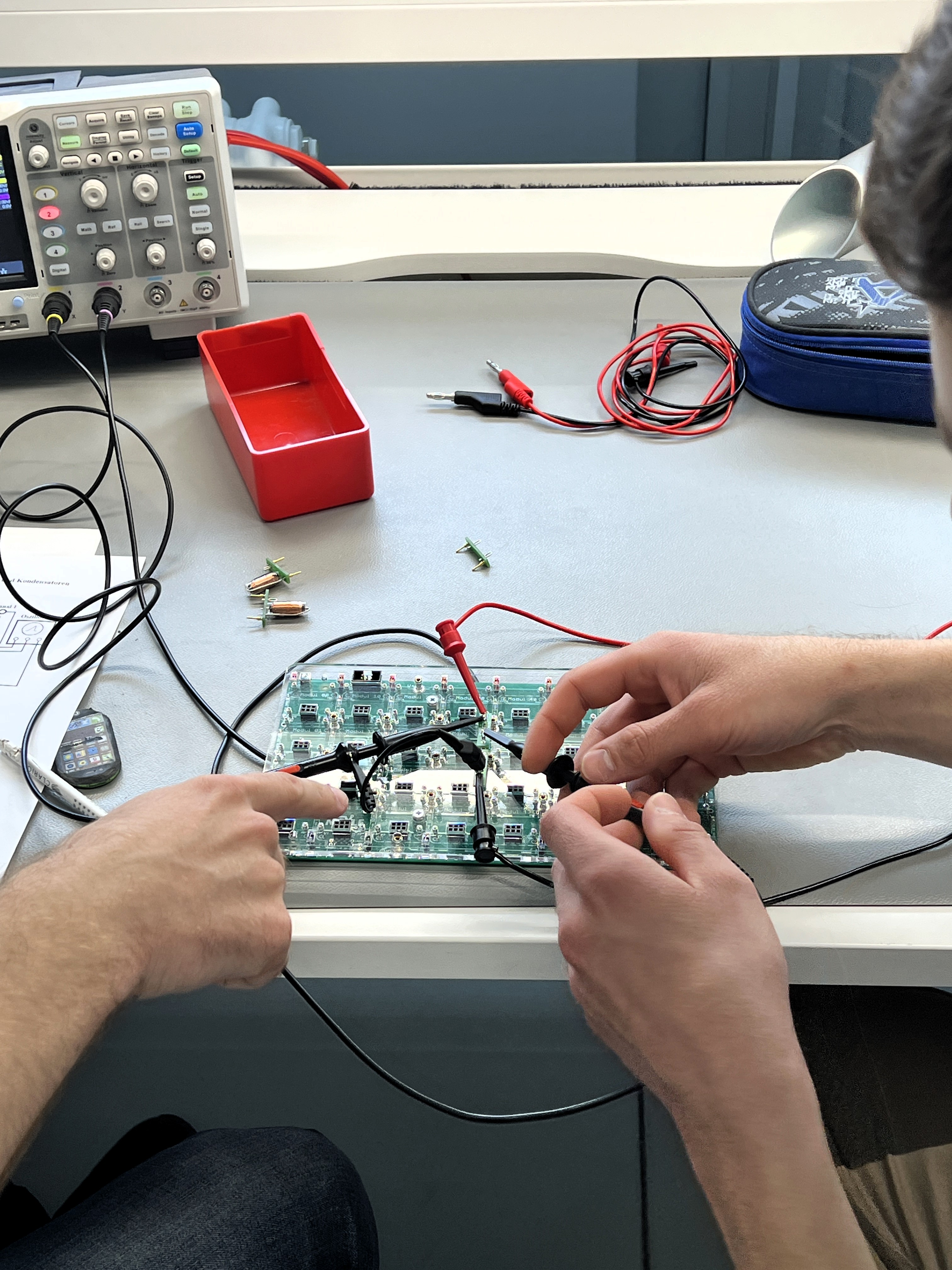 „MEXLEfirst“ unterstützt Studierende interaktiv und individuell dabei, grundlegende Konzepte der Elektrotechnik zu erlernen. Die Idee: Eine umfassende, praxisorientierte Lernumgebung schaffen, welche die Lücke zwischen theoretischem Wissen und praktischer Anwendung in der elektrotechnischen Ausbildung schließt. Während herkömmliche Elektrotechnik-Laborübungen den Fokus auf das manuelle Aufbauen und Messen legen, soll „MEXLEfirst“ eine zusätzliche digitale Ebene hinzufügen: Eine Smartphone-App wird zukünftig automatisch das gesteckte Schaltungslayout erkennen, Tipps geben und den Lernfortschritt dokumentieren. In der Praxis heißt das, Studierende lösen Schaltkreis-Aufgaben durch die Anbringung von elektrischen Komponenten wie Widerständen und Operationsverstärkern auf der intelligenten Grundplatine. Tipps zur Schaltungsentwicklung und ob die Lösung korrekt ist, erfahren sie über ihr Mobiltelefon. Dieses tauscht Sensorwerte und Schaltungsinformationen mit der Grundplatine aus. Eine entsprechende Homepage überprüft Lösungswege und gibt den Studierenden direkt Feedback. Alles was für die Anwendung nötig ist, passt in einen kleinen Koffer: Lab-in-a-Box.