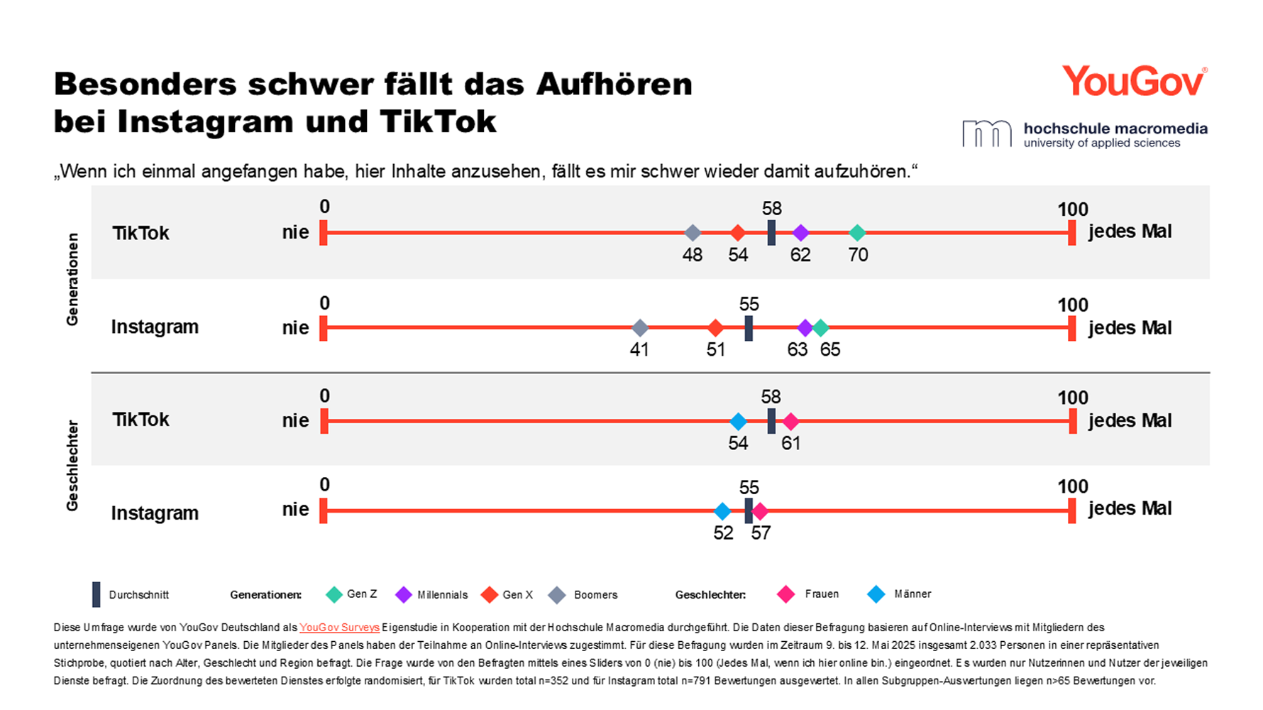 Diese Umfrage wurde von YouGov Deutschland als YouGov Surveys Eigenstudie in Kooperation mit der Hochschule Macromedia durchgeführt. Die Daten dieser Befragung basieren auf Online-Interviews mit Mitgliedern des unternehmenseigenen YouGov Panels. Die Mitglieder des Panels haben der Teilnahme an Online-Interviews zugestimmt. Insgesamt 2.033 Personen wurden im Zeitraum 9. bis 12. Mai 2025 befragt. Die Erhebung wurde nach Alter, Geschlecht und Region quotiert und die Ergebnisse anschließend entsprechend gewichtet. Die Ergebnisse sind repräsentativ für die Wohnbevölkerung in Deutschland ab 18 Jahren.