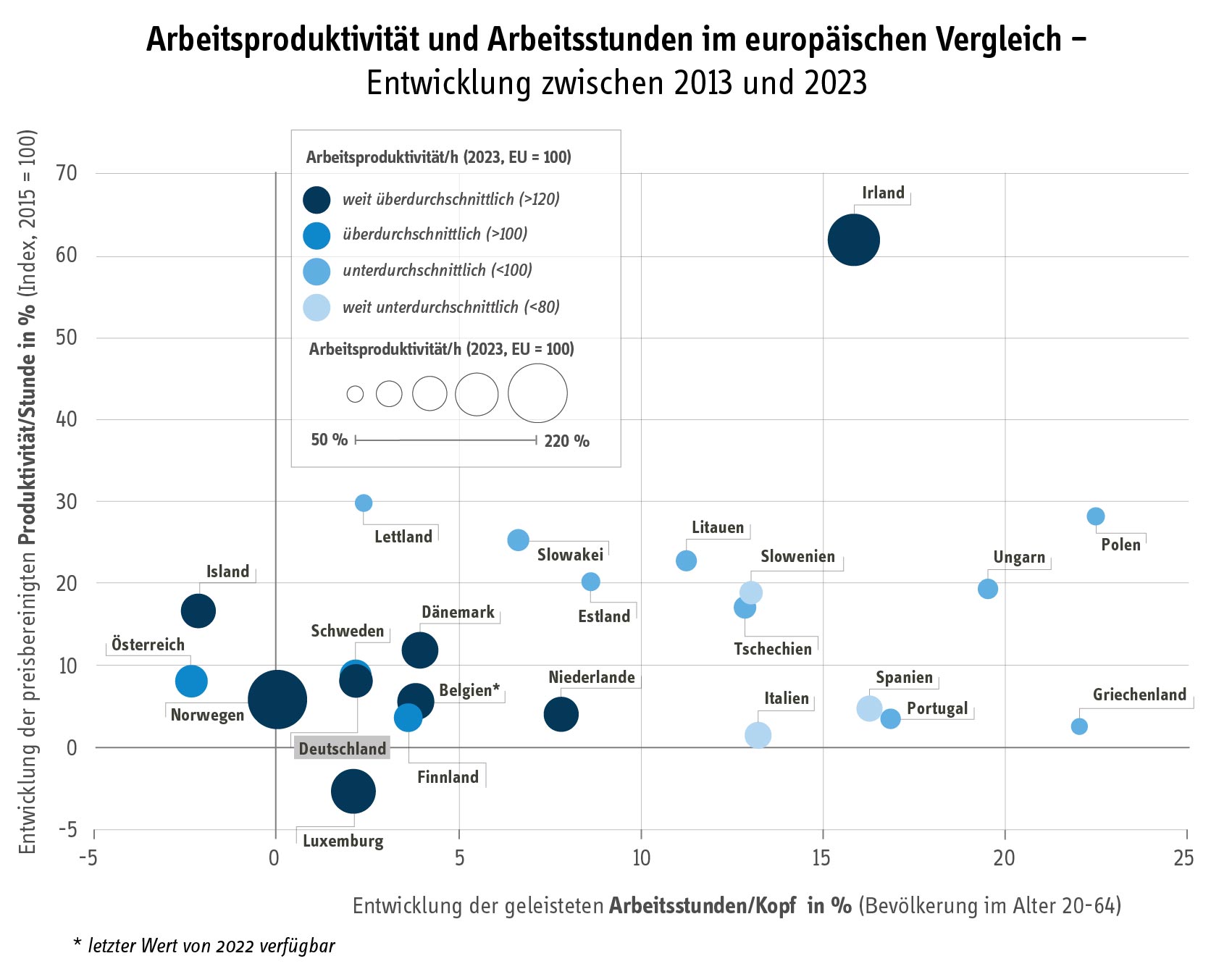 Ein Blick auf die Daten offenbart die eigentliche Realität: Die inflations- und kaufkraftbereinigte Arbeitsproduktivität misst, wie viel BIP pro Erwerbstätigen und geleistete Stunde erwirtschaftet wird. Wir haben in einer einzigen Grafik das aktuelle Niveau der Arbeitsproduktivität, das Produktivitätswachstum und den Anstieg der geleisteten Arbeitsstunden pro Kopf dargestellt. Die x-Achse zeigt die Veränderung der geleisteten Arbeitsstunden, die y-Achse zeigt die Veränderung der Produktivität je Arbeitsstunde – jeweils über einen Zeitraum von 10 Jahren. Die Farbe und Größe der Blasen gibt die Produktivität an. Die Referenz ist 100 als Durchschnitt der kaufkraftbereinigten Arbeitsproduktivität in Europa.