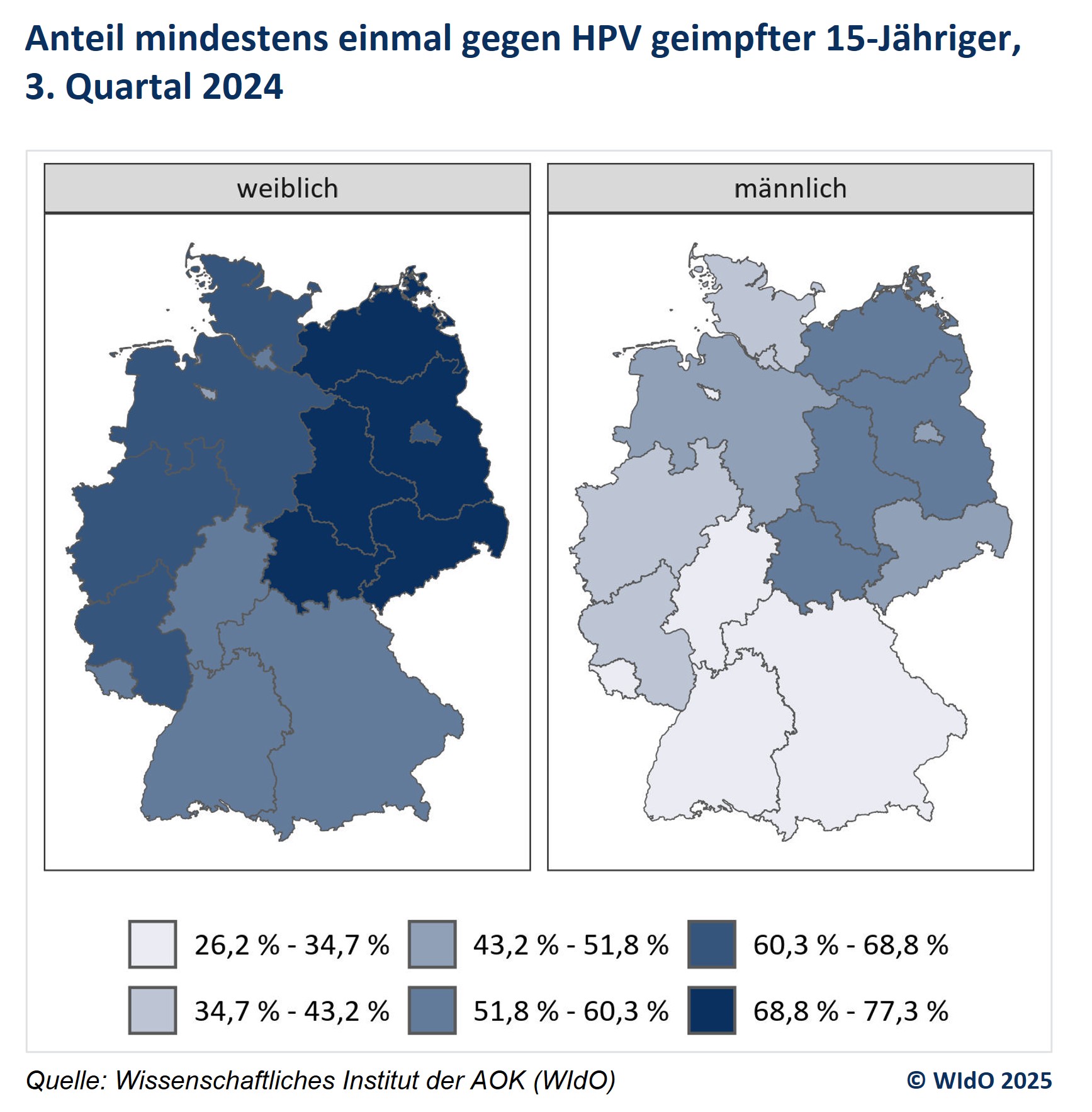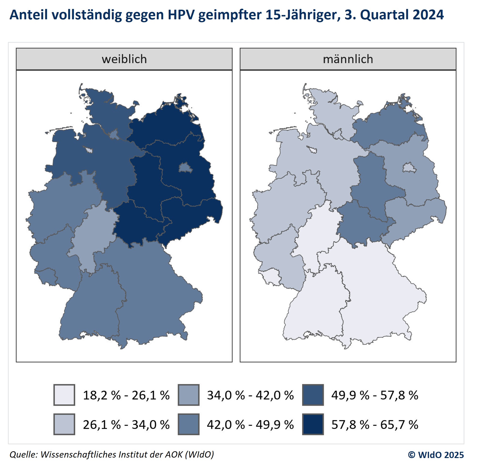 Die WIdO-Auswertung zeigt zudem, wie stark die Impfquoten auf Ebene der Bundesländer variieren. So waren in Bremen im dritten Quartal 2024 nur 32,9 Prozent der 15-jährigen Mädchen vollständig gegen HPV geimpft, während in Sachsen-Anhalt die Quote mit 65,7 Prozent nahezu doppelt so hoch war. Scheller-Kreinsen: „Insgesamt zeigt sich, dass die Impfquoten in den östlichen Bundesländern (ohne Berlin) mit mindestens 60 Prozent deutlich höher sind als in den westlichen. Hier liegt die Impfquote im Schnitt bei nur 47 Prozent.“